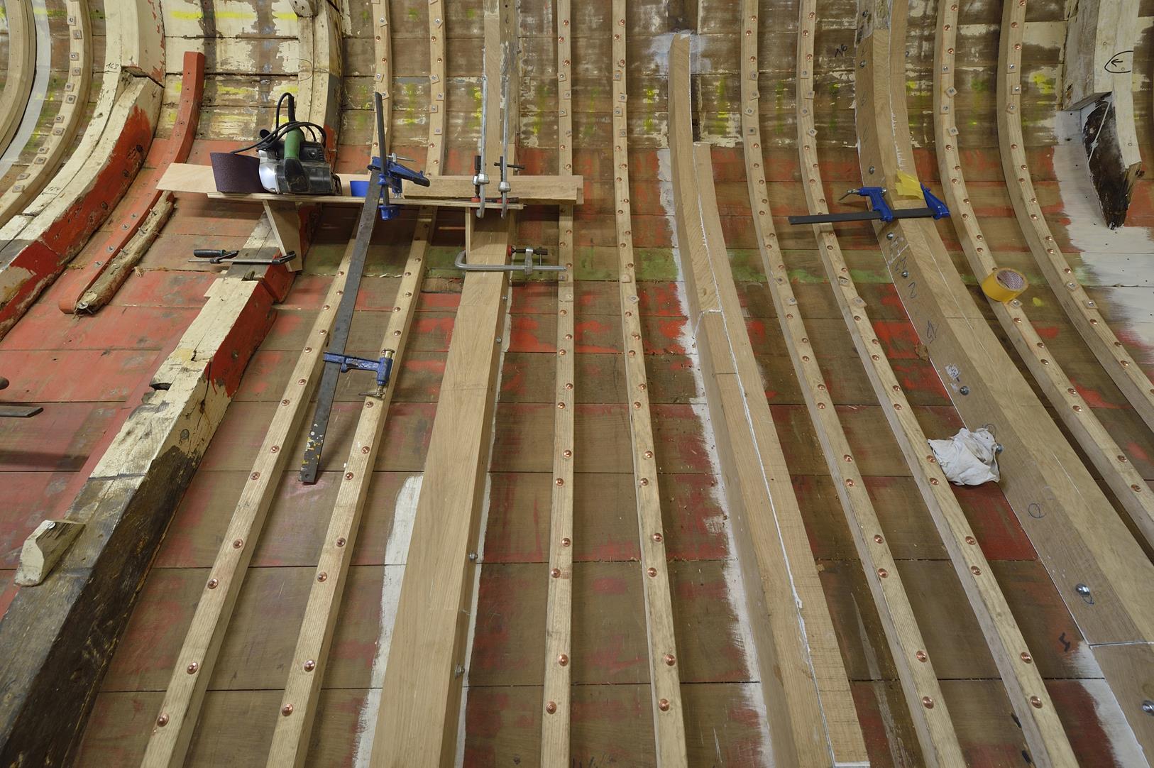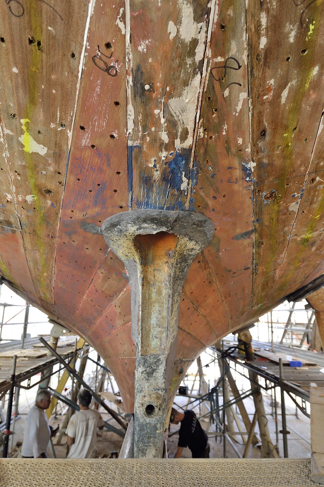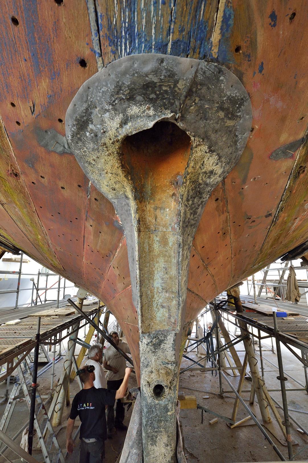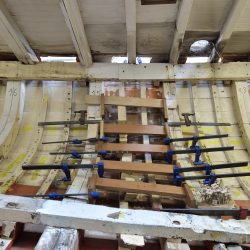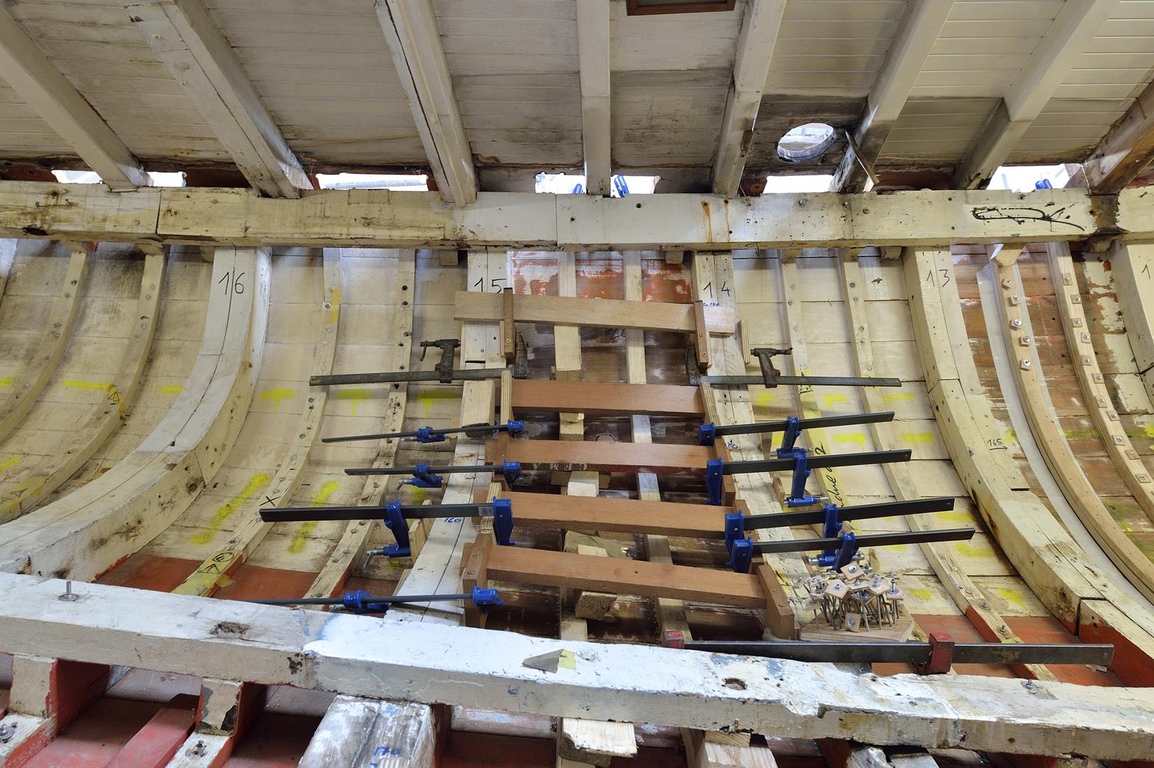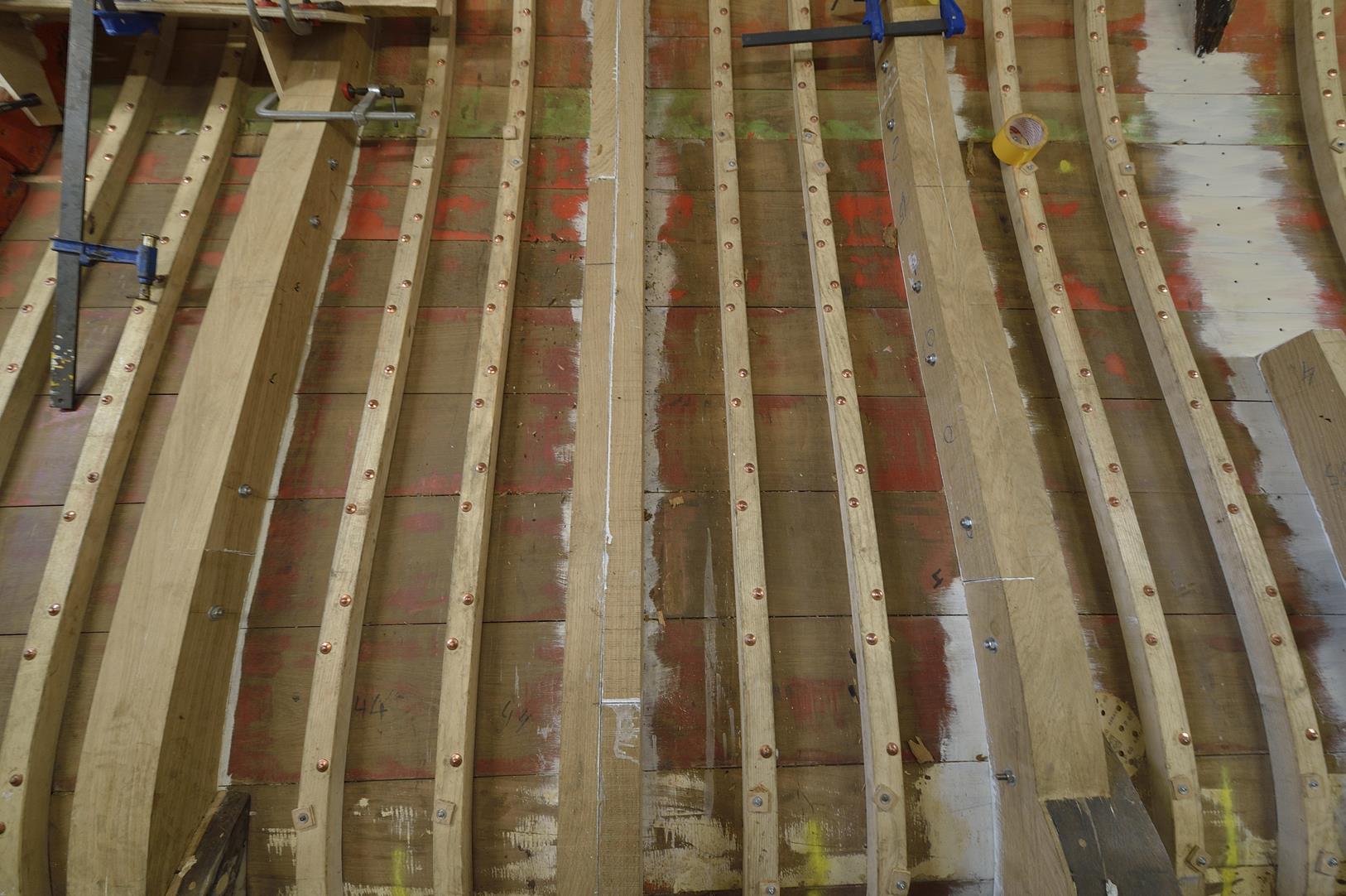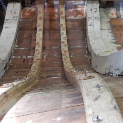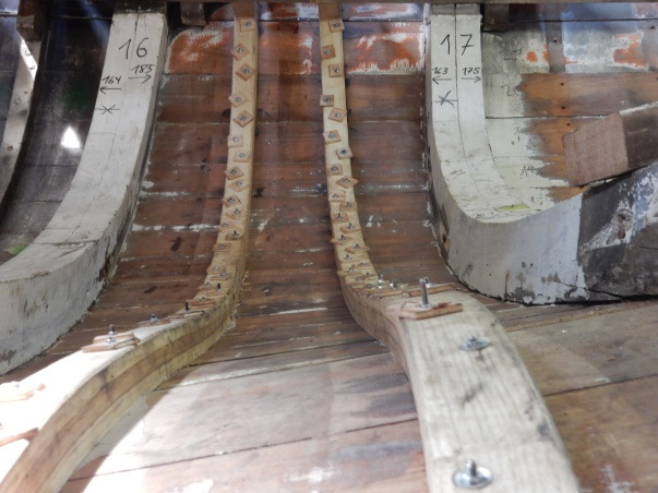 Templates laid out on top of grown oak bends for new sawn frames aft. New “laminated” steam bent frames aft Templates laid out on top of grown oak bends for new sawn frames aft. Damaged wood around rudder tube in horn timber Damaged wood around rudder tube in horn timber New “laminated” steam bent frames aft