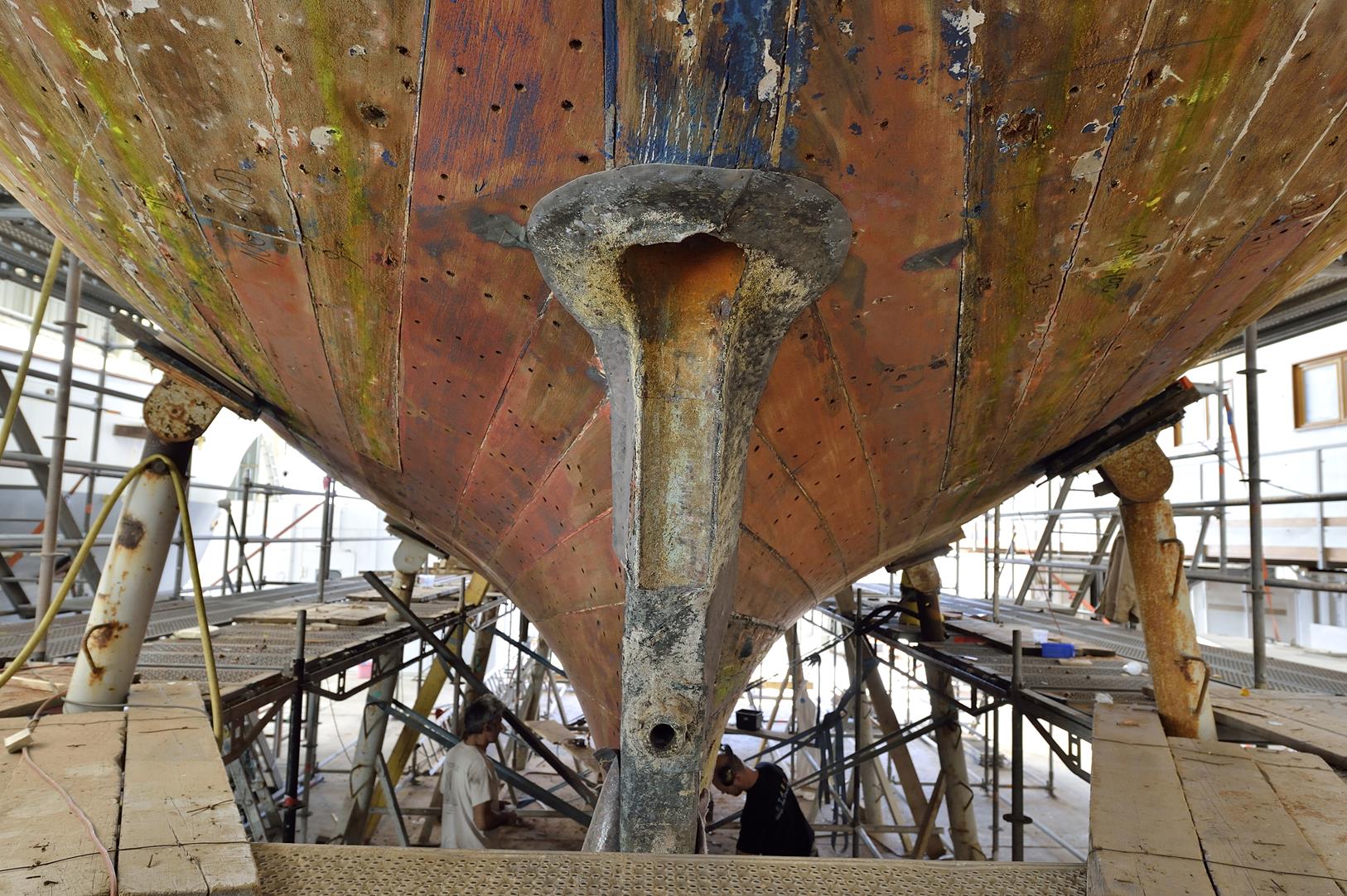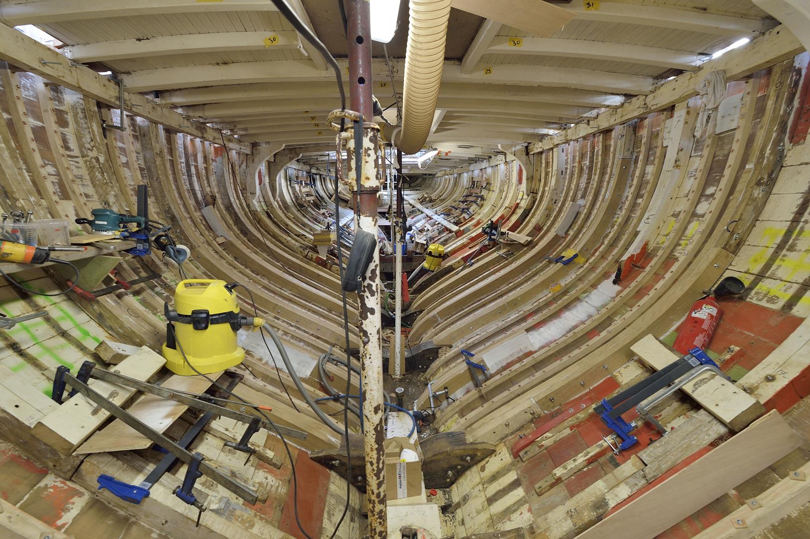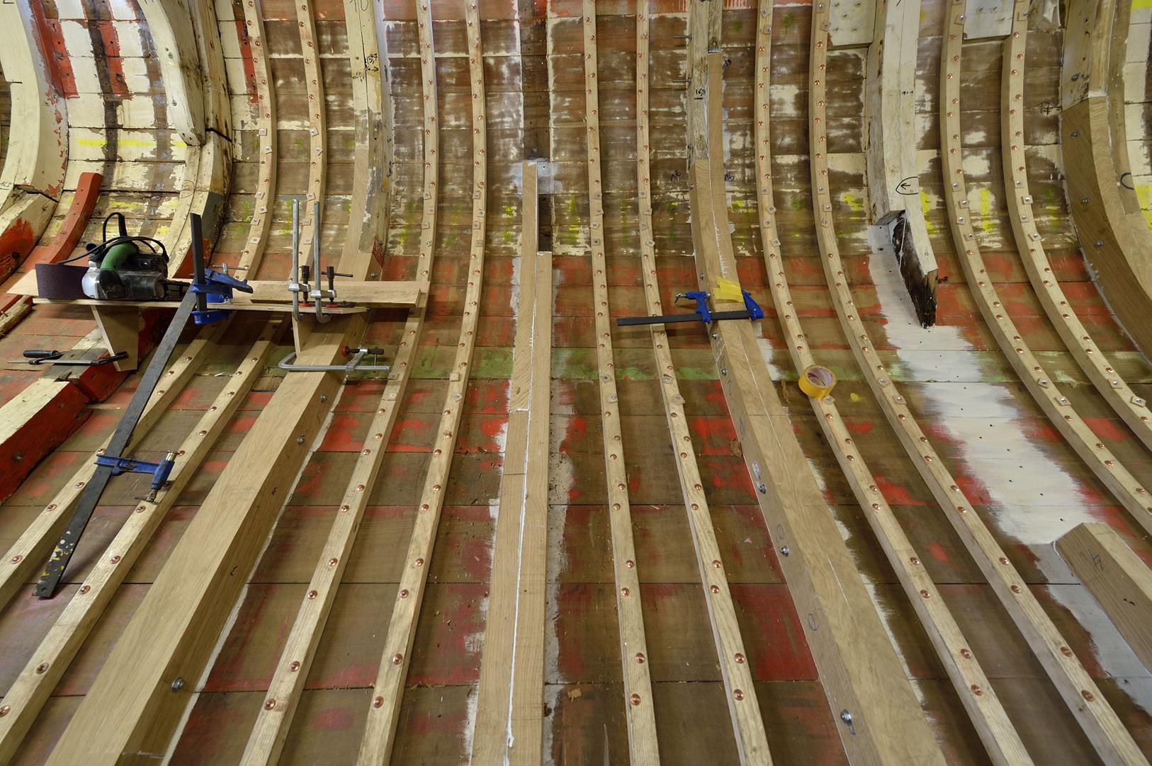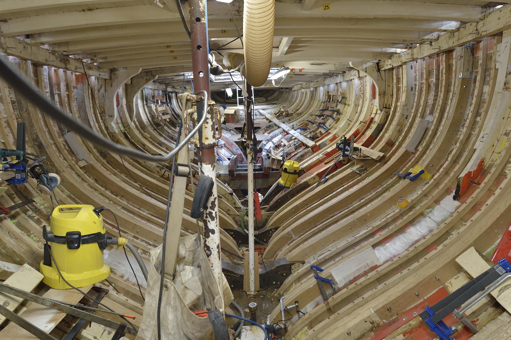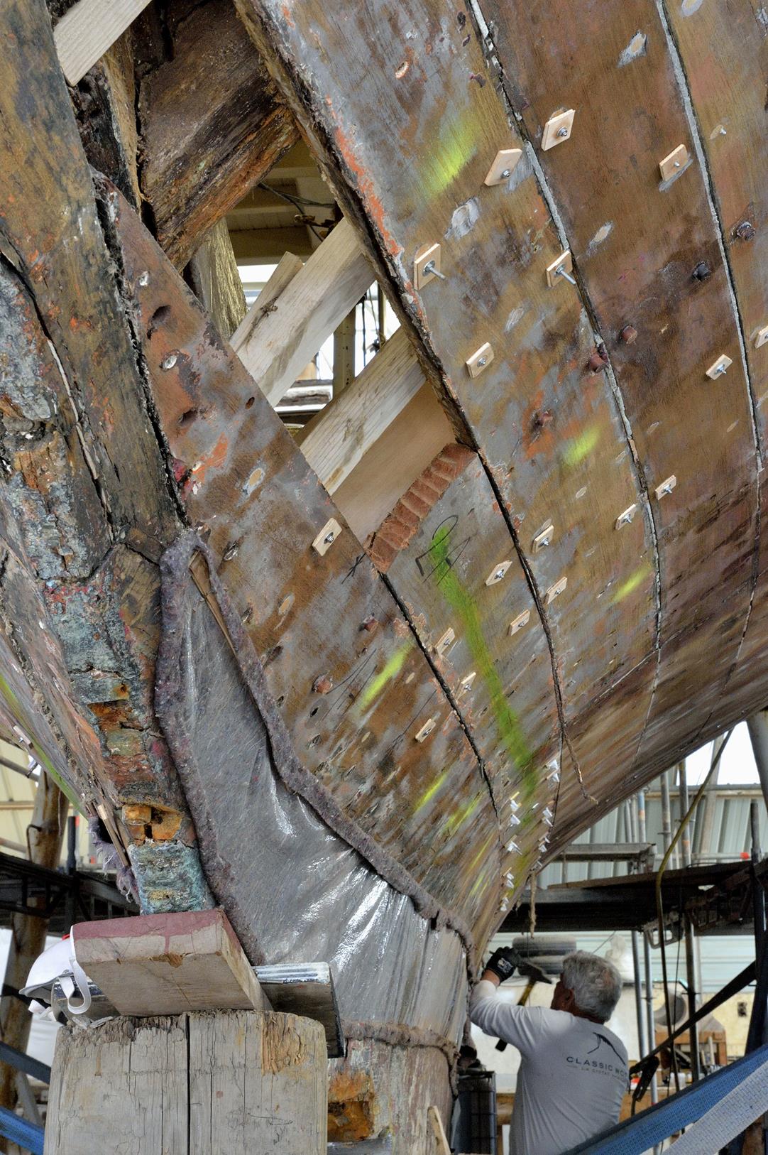 Templates laid out on top of grown oak bends for new sawn frames aft. New “laminated” steam bent frames aft Templates laid out on top of grown oak bends for new sawn frames aft. Damaged wood around rudder tube in horn timber Damaged wood around rudder tube in horn timber New “laminated” steam bent frames aft