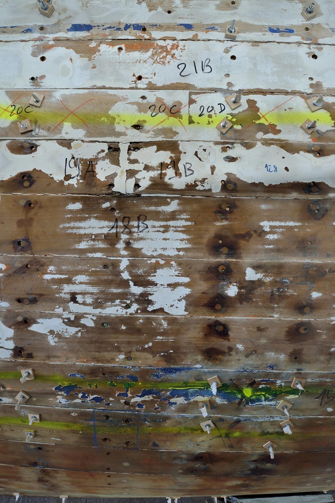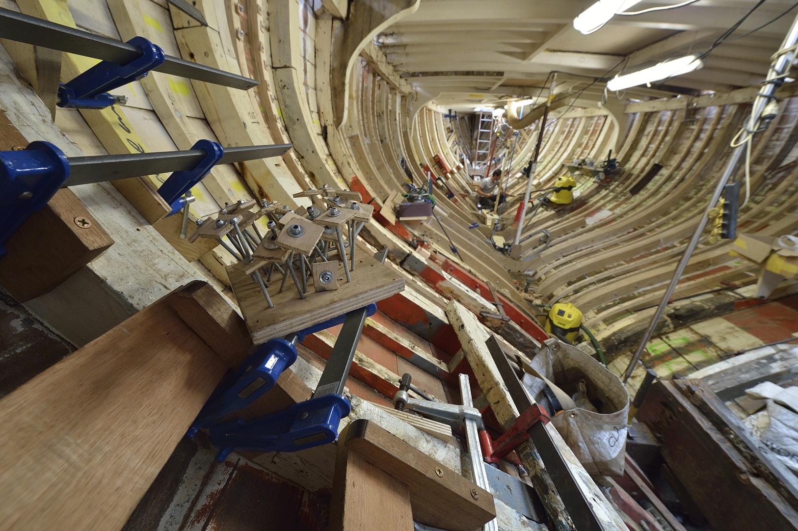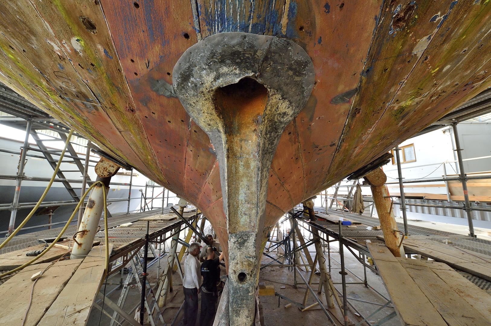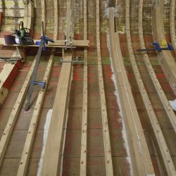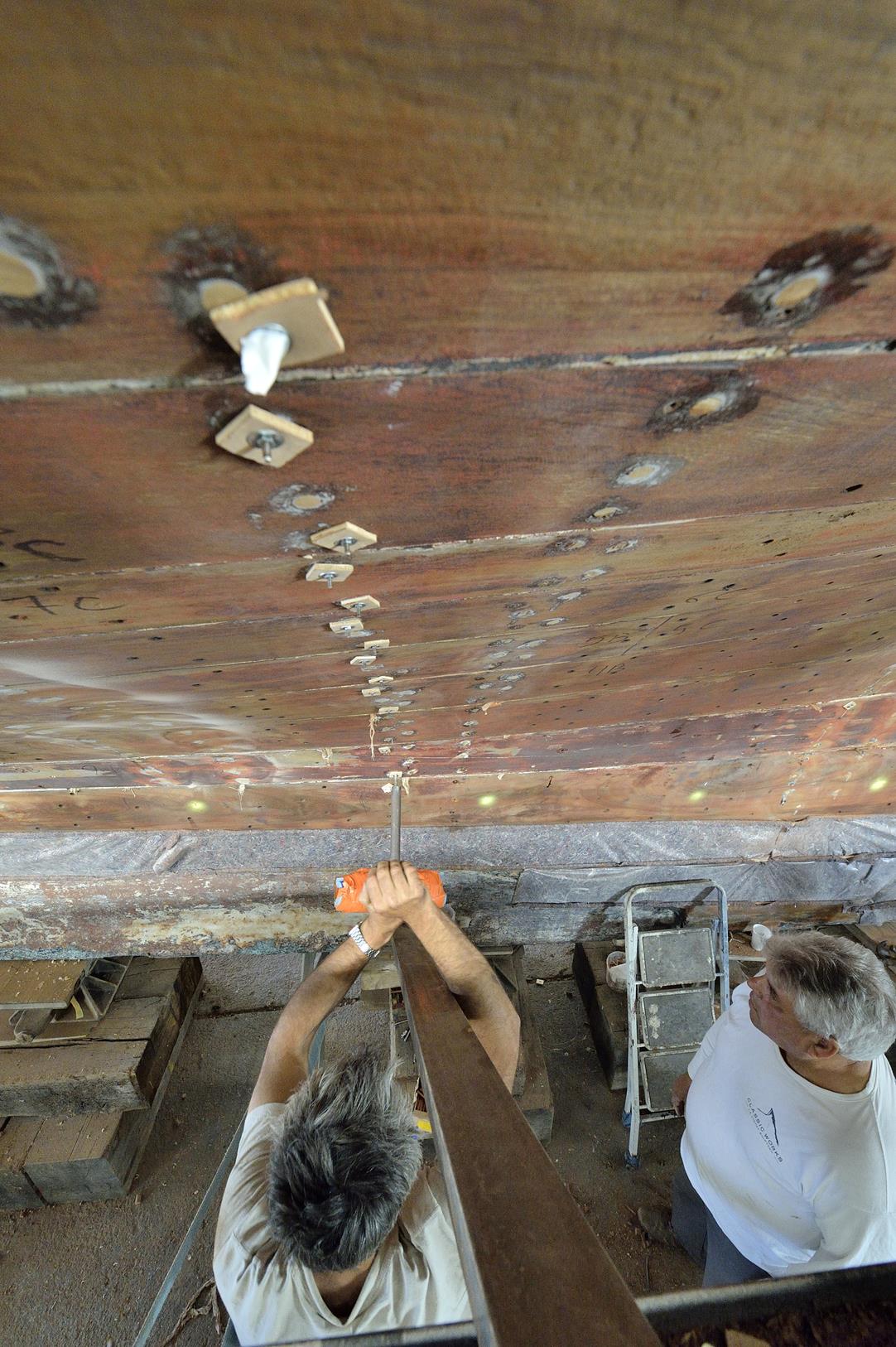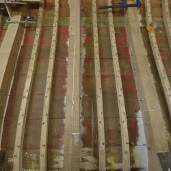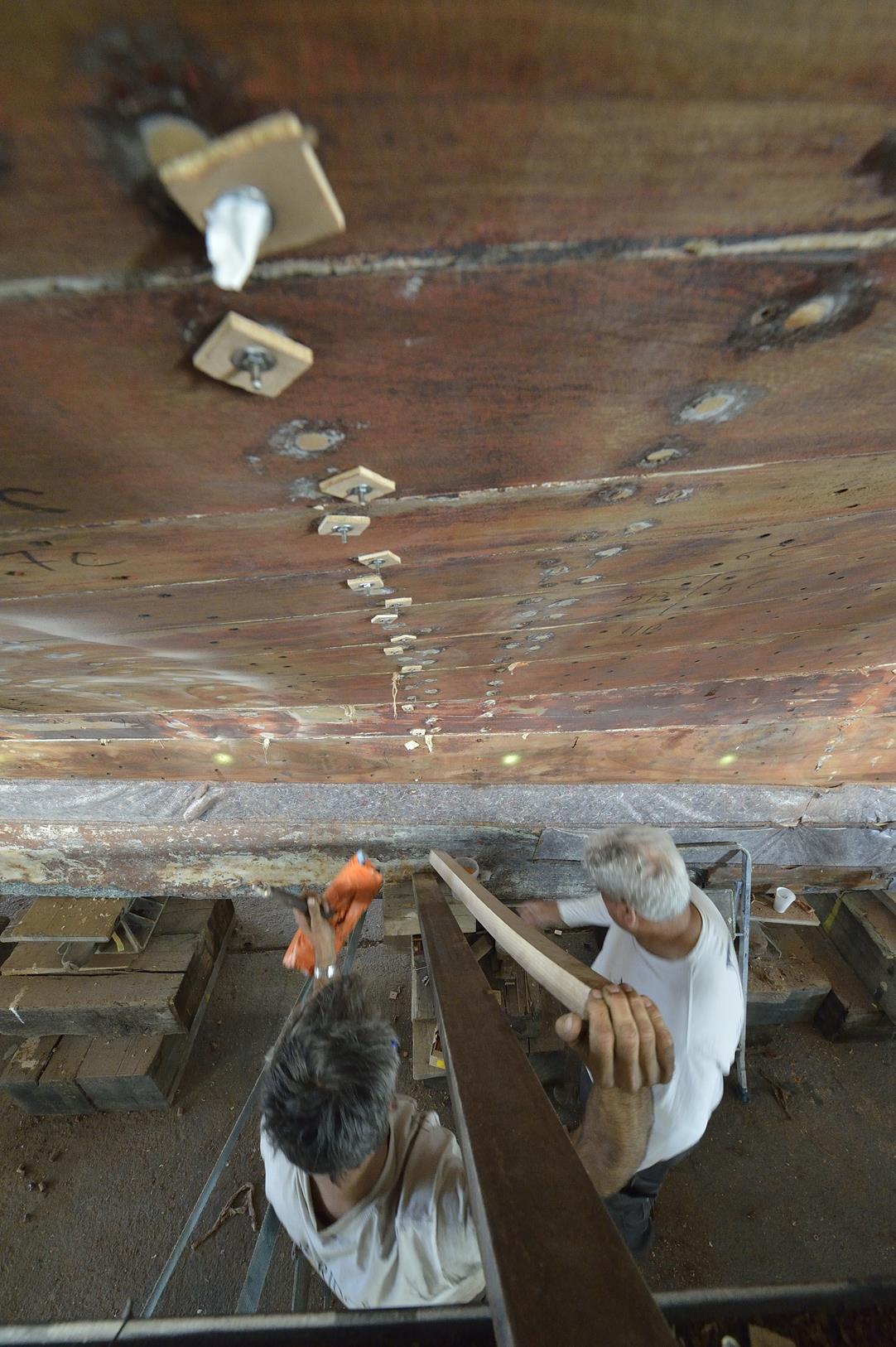 Templates laid out on top of grown oak bends for new sawn frames aft. New “laminated” steam bent frames aft Templates laid out on top of grown oak bends for new sawn frames aft. Damaged wood around rudder tube in horn timber Damaged wood around rudder tube in horn timber New “laminated” steam bent frames aft