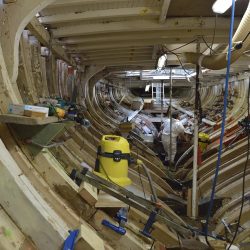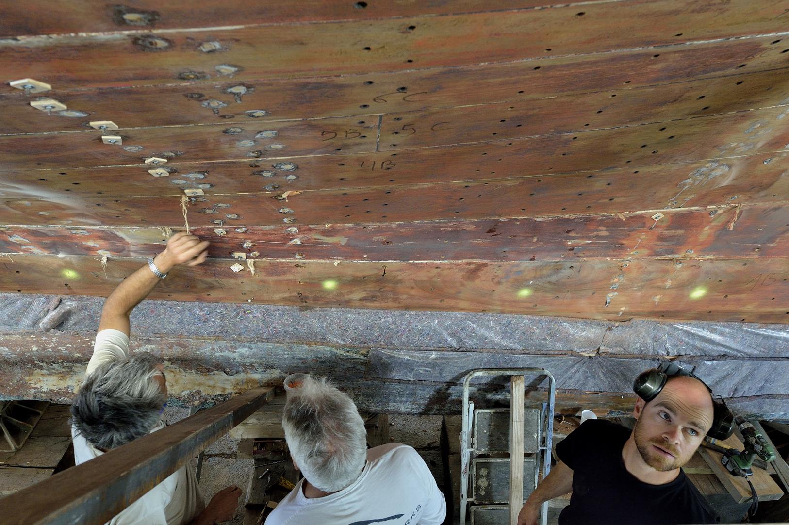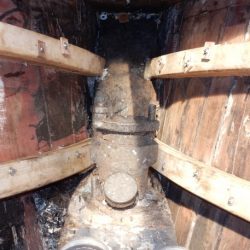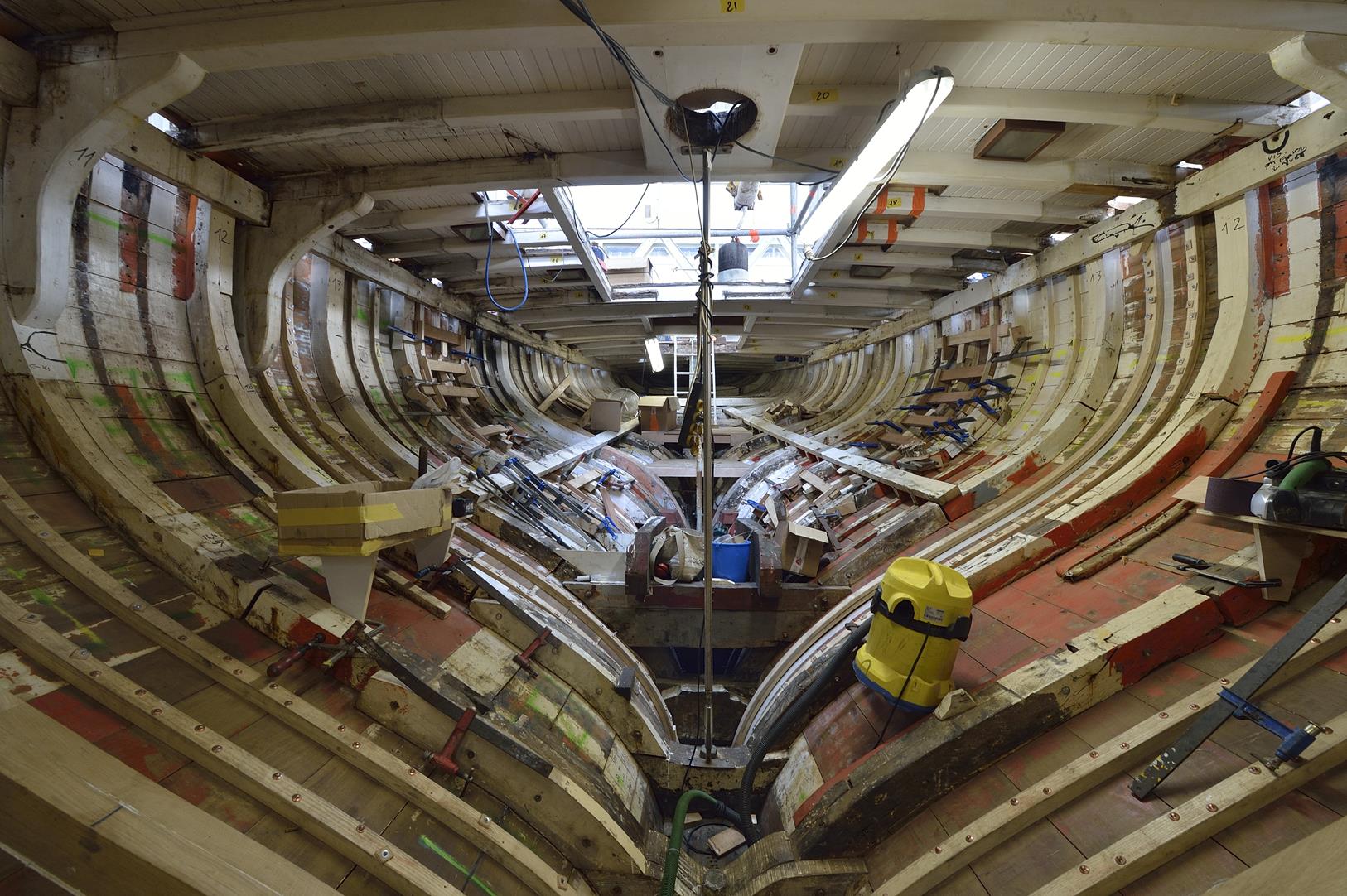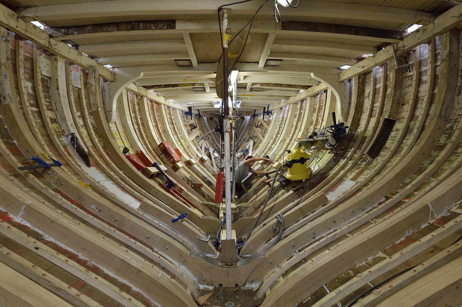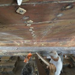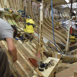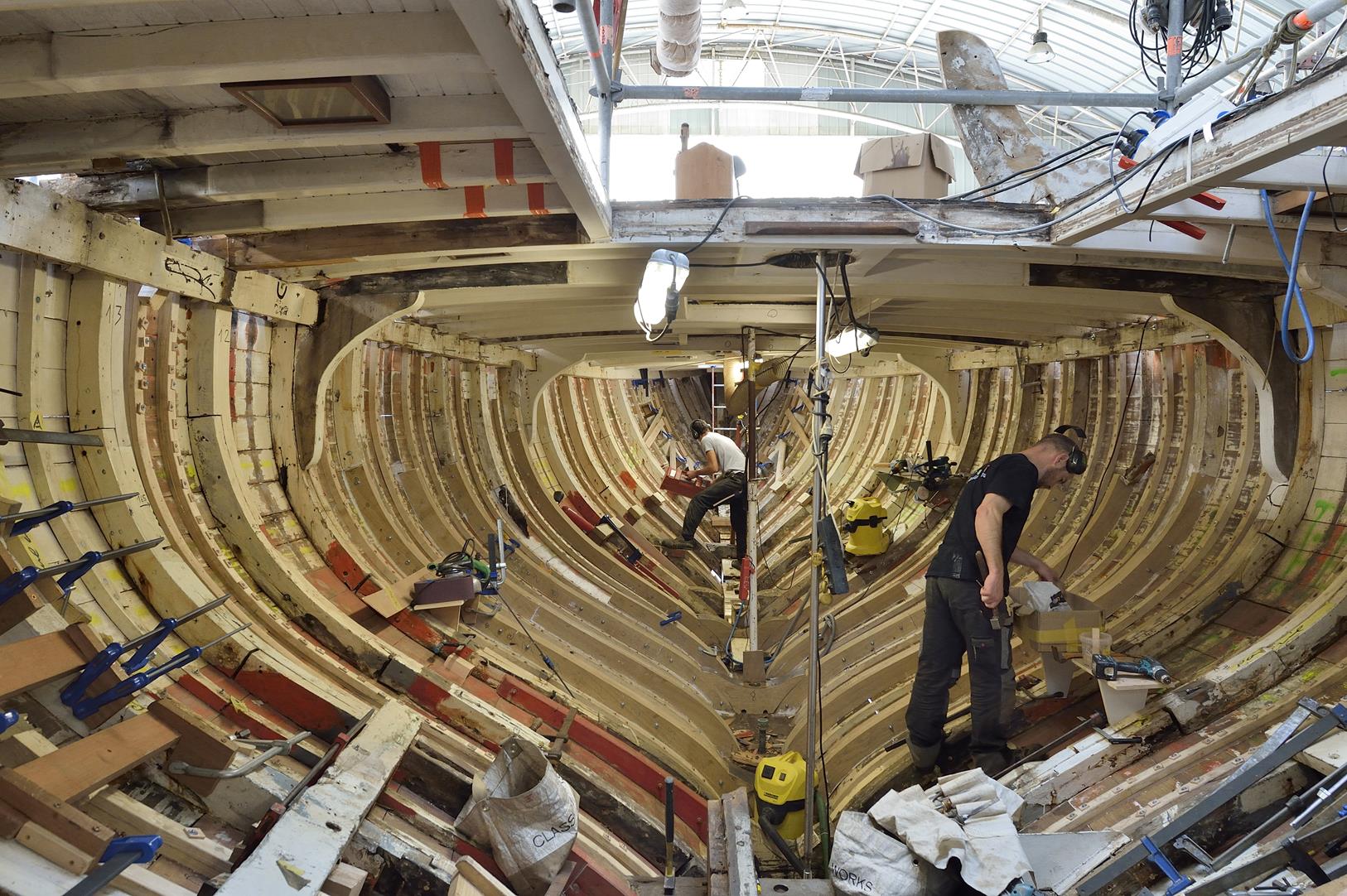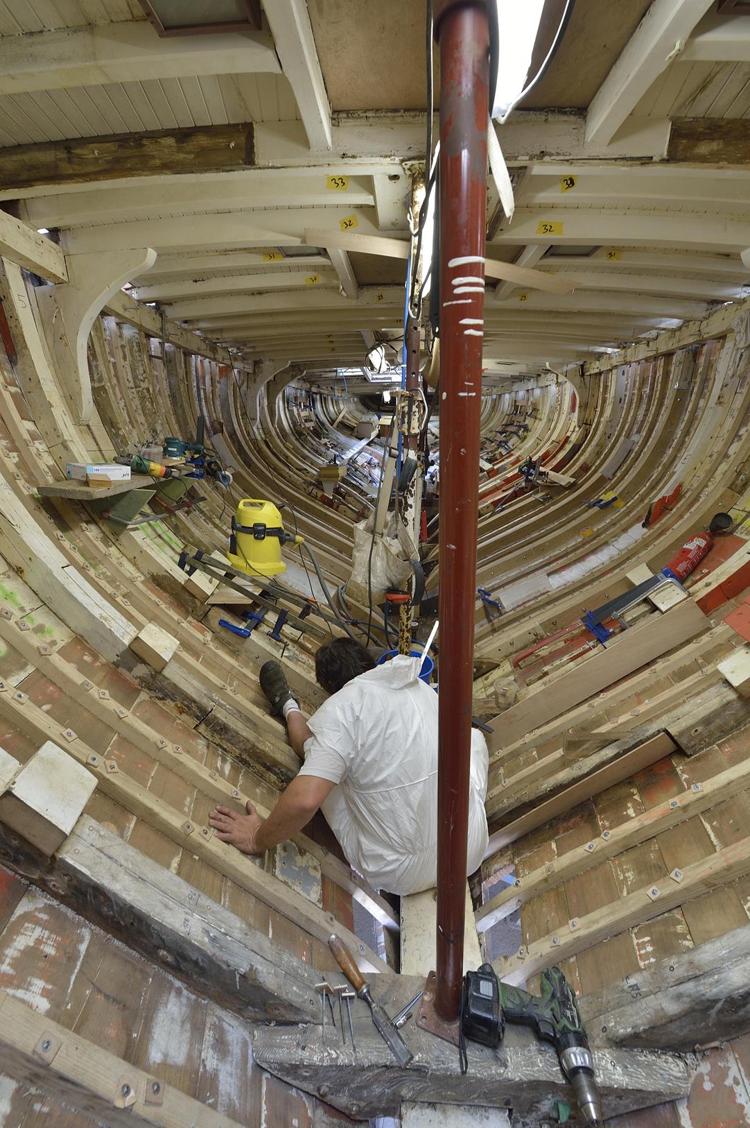 Templates laid out on top of grown oak bends for new sawn frames aft. New “laminated” steam bent frames aft Templates laid out on top of grown oak bends for new sawn frames aft. Damaged wood around rudder tube in horn timber Damaged wood around rudder tube in horn timber New “laminated” steam bent frames aft