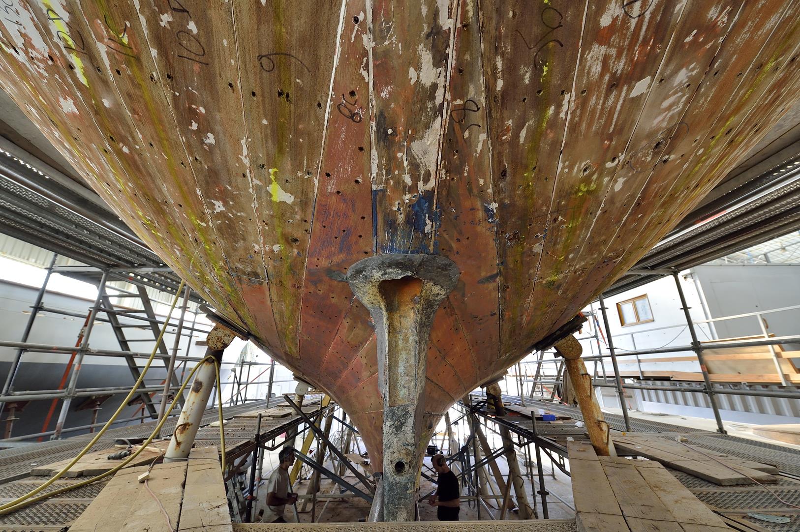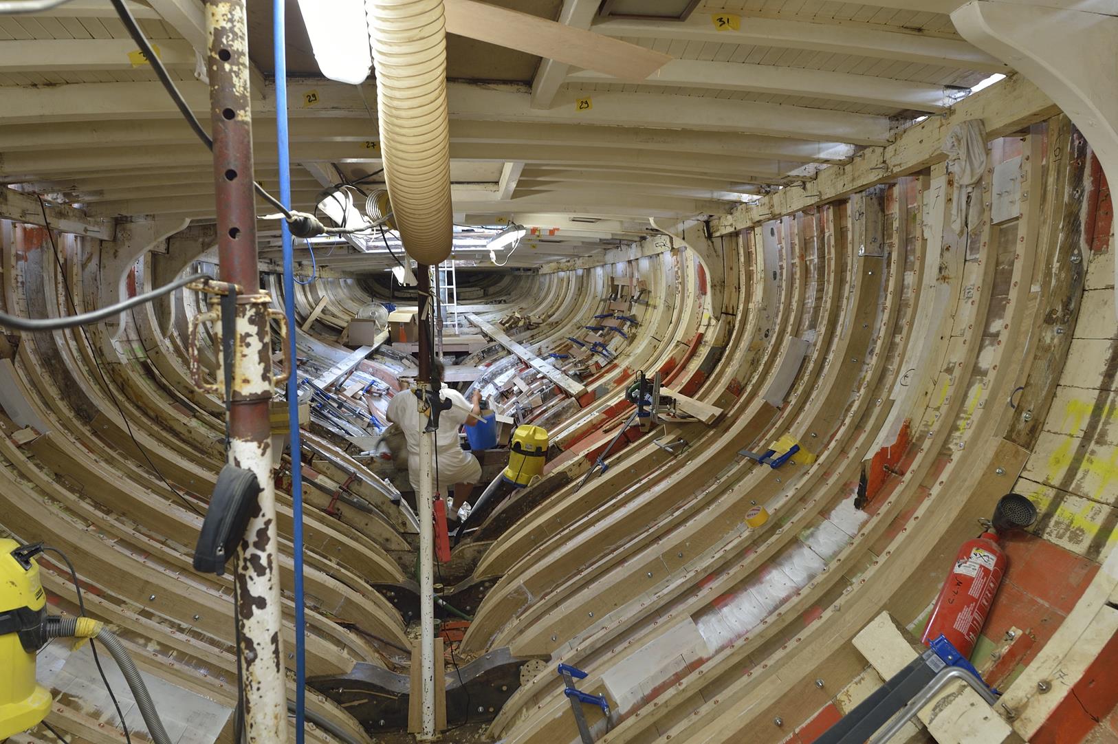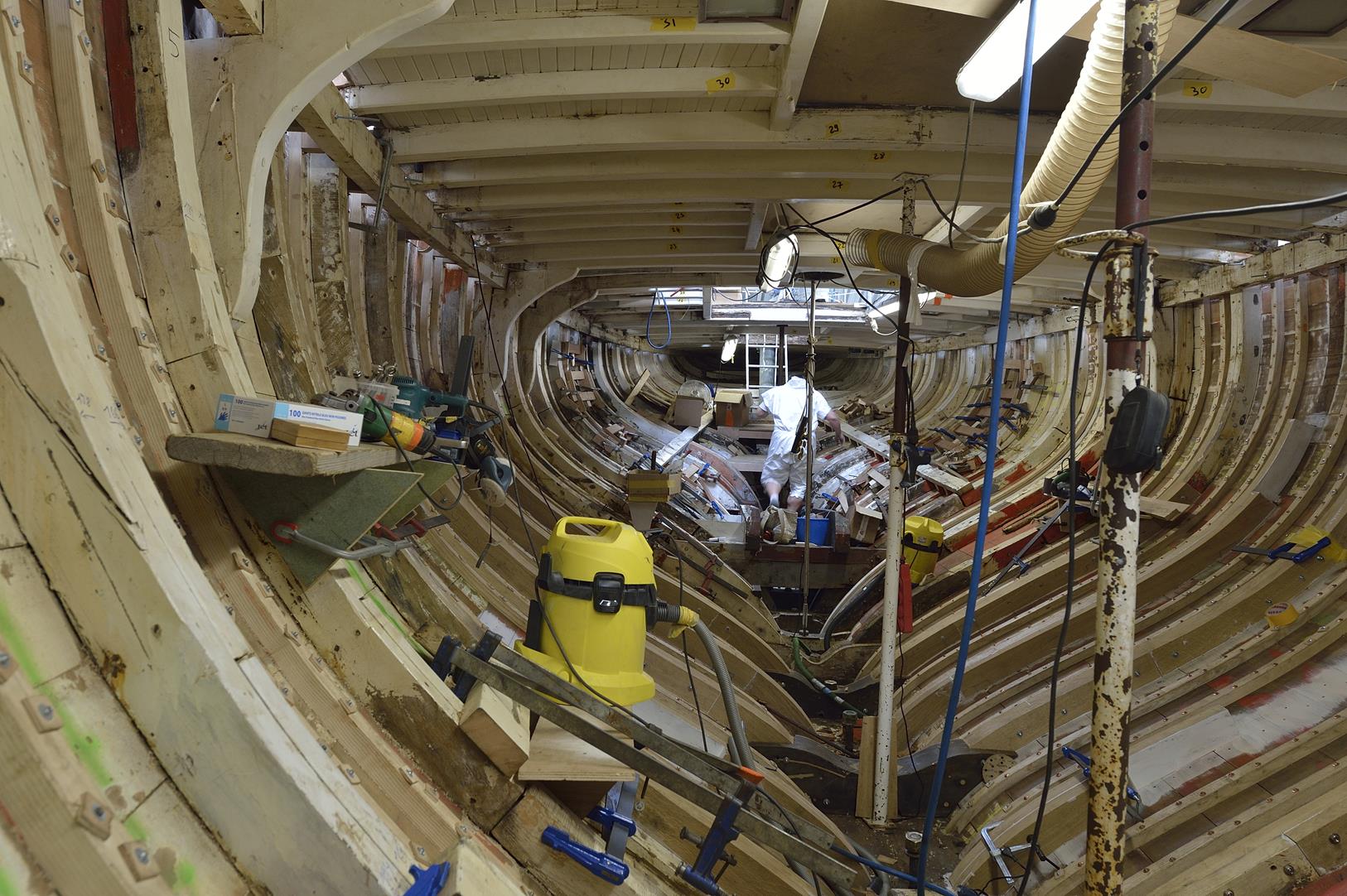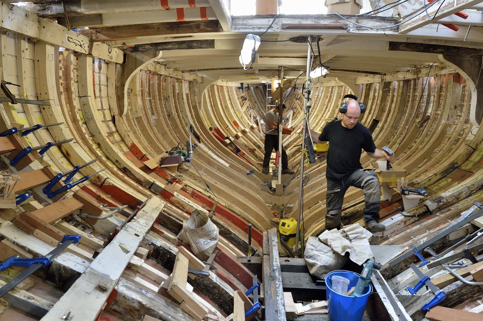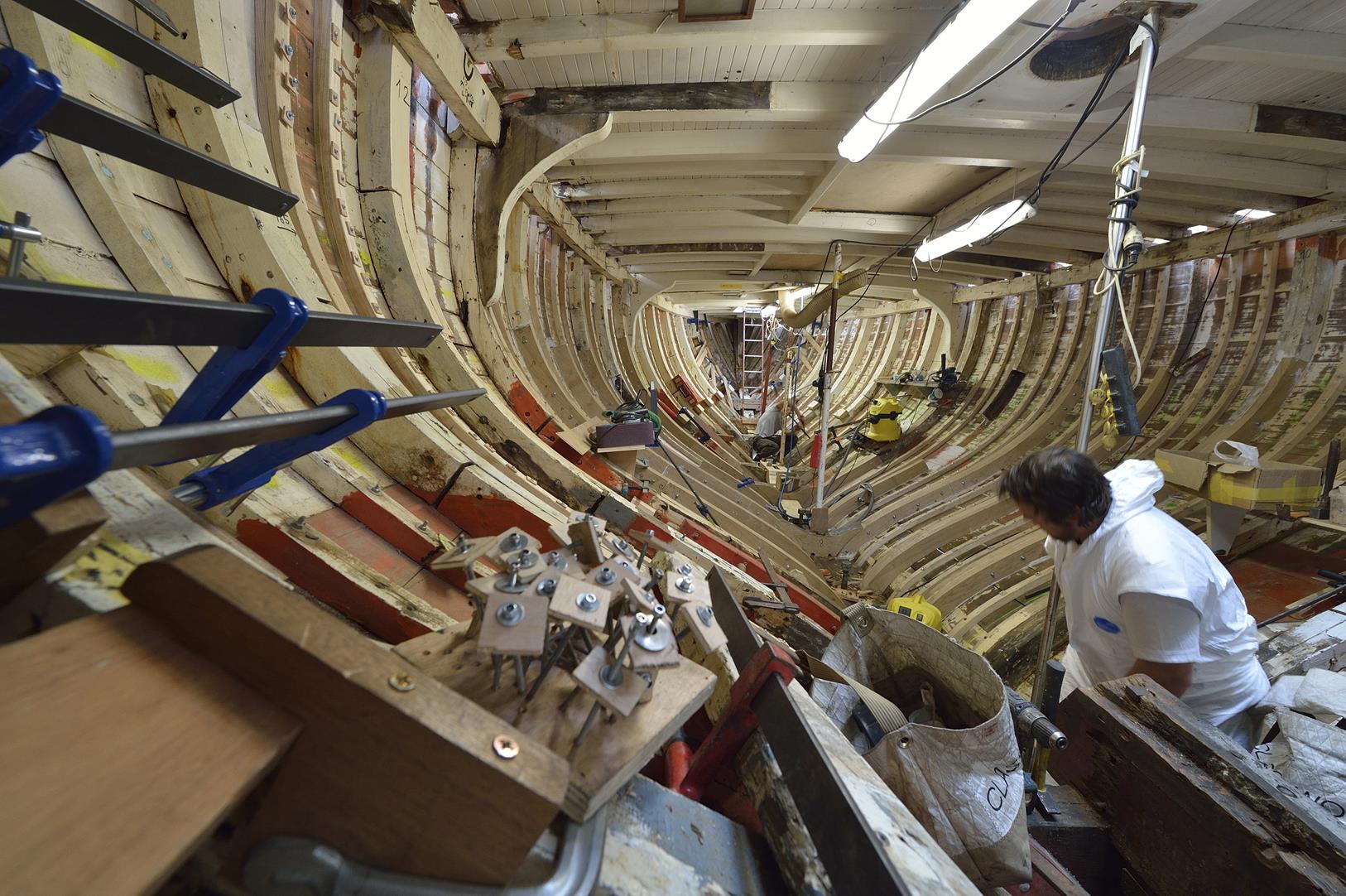 Templates laid out on top of grown oak bends for new sawn frames aft. New “laminated” steam bent frames aft Templates laid out on top of grown oak bends for new sawn frames aft. Damaged wood around rudder tube in horn timber Damaged wood around rudder tube in horn timber New “laminated” steam bent frames aft