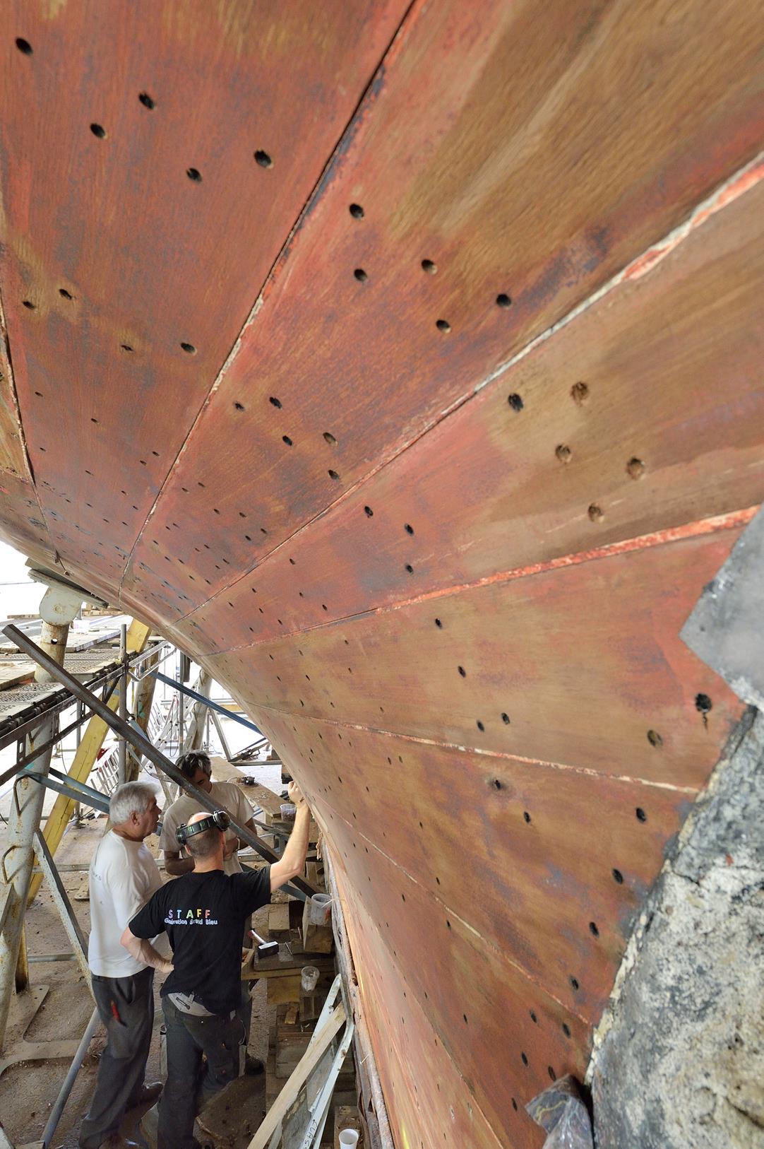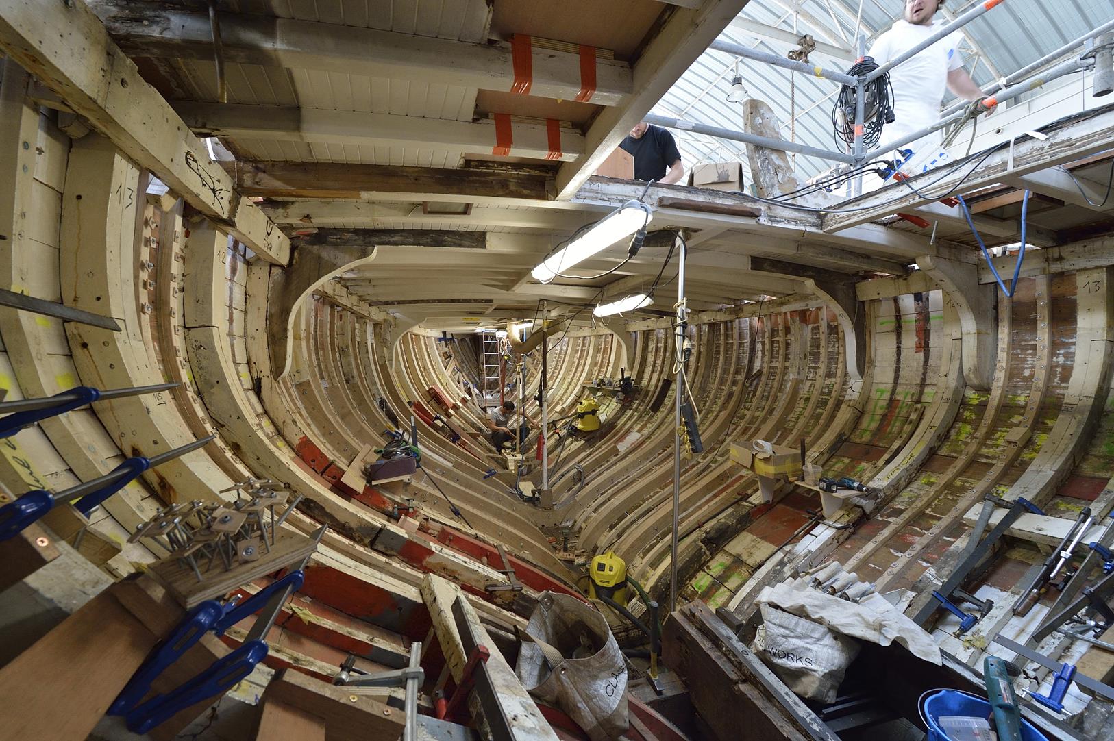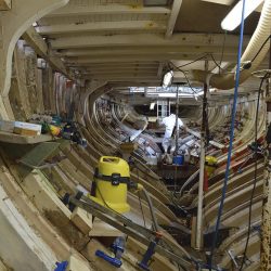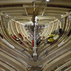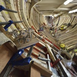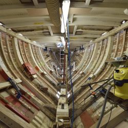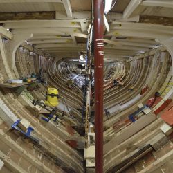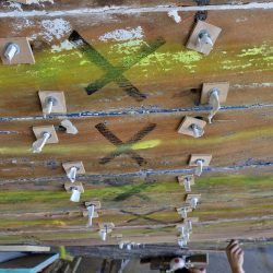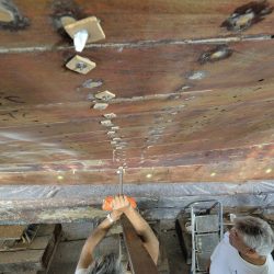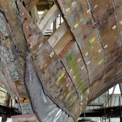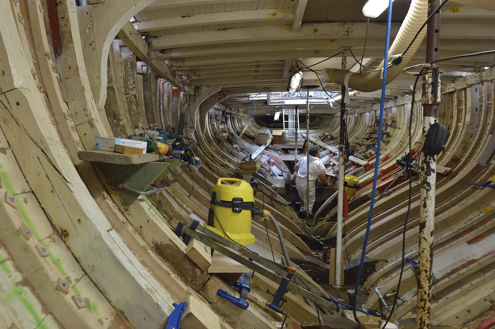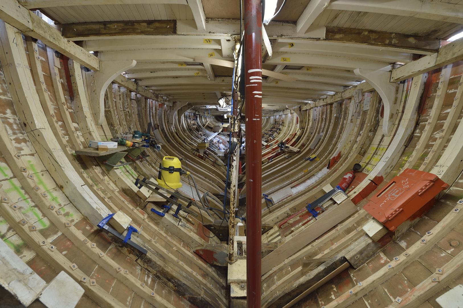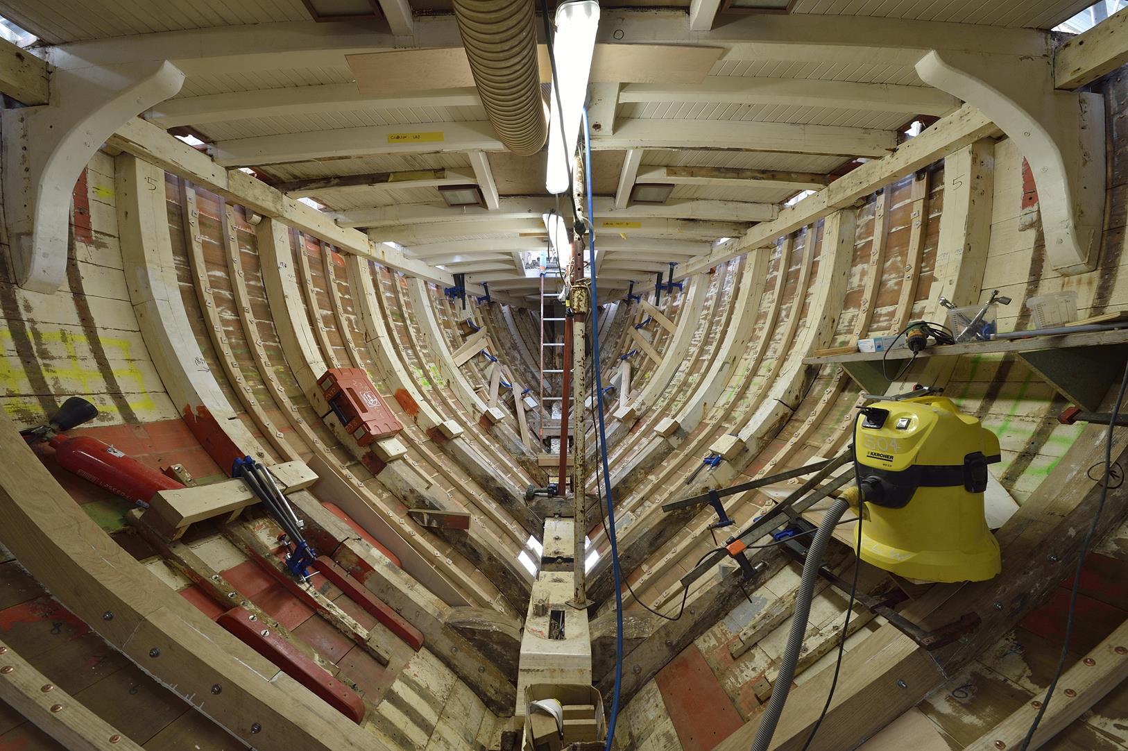 Templates laid out on top of grown oak bends for new sawn frames aft. New “laminated” steam bent frames aft Templates laid out on top of grown oak bends for new sawn frames aft. Damaged wood around rudder tube in horn timber Damaged wood around rudder tube in horn timber New “laminated” steam bent frames aft