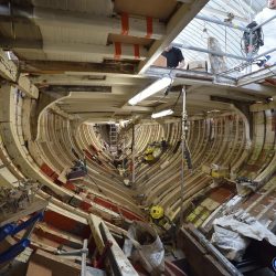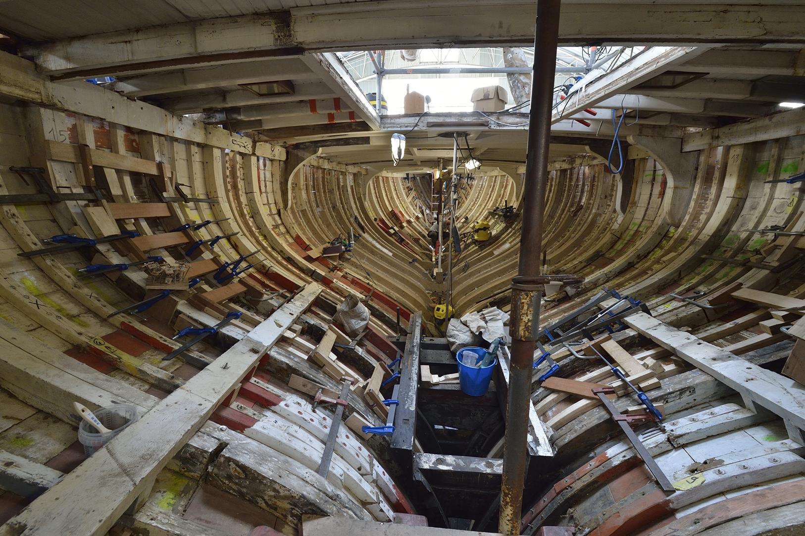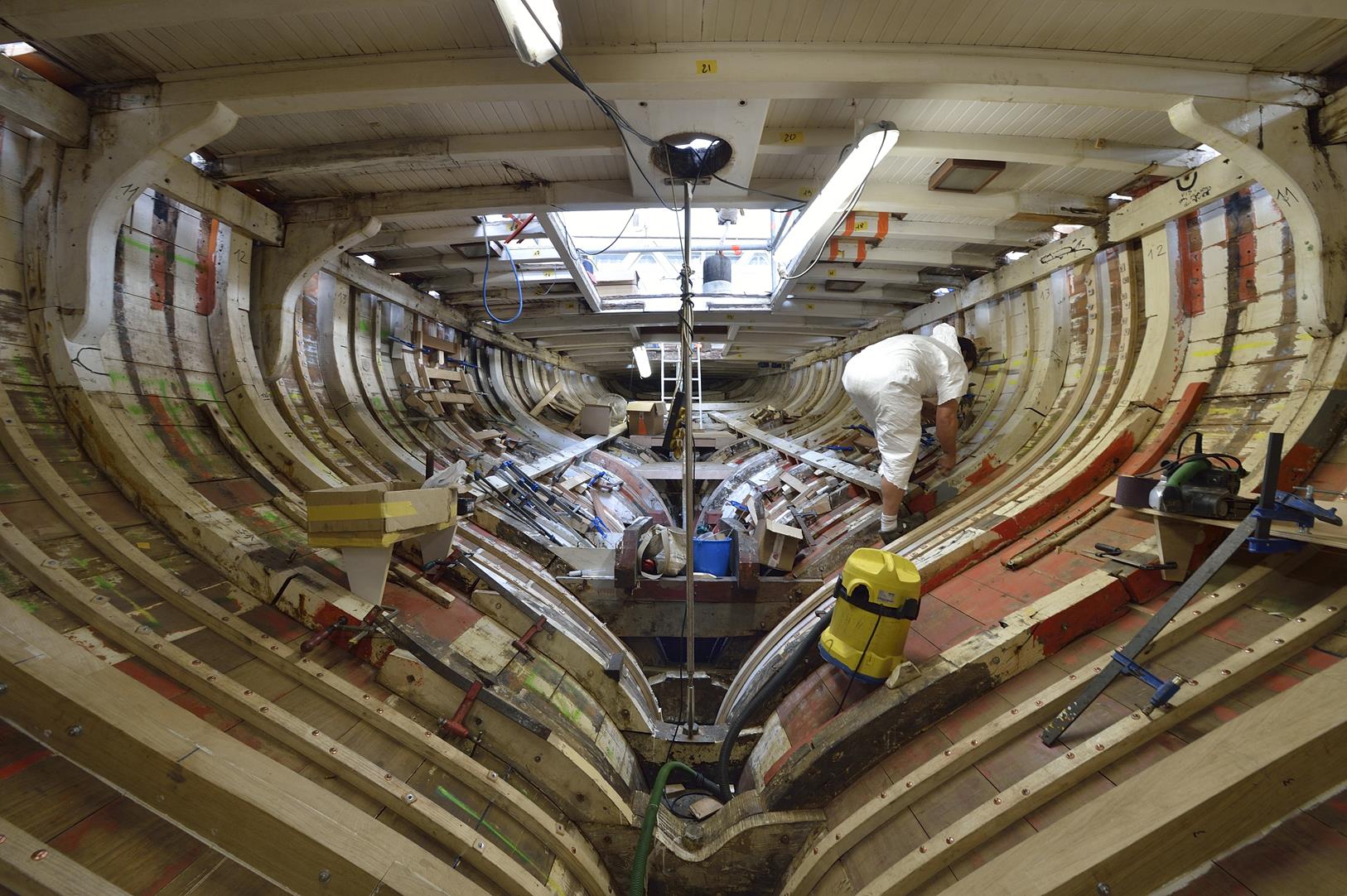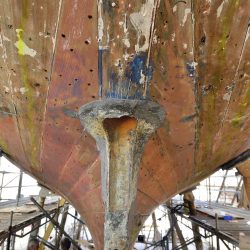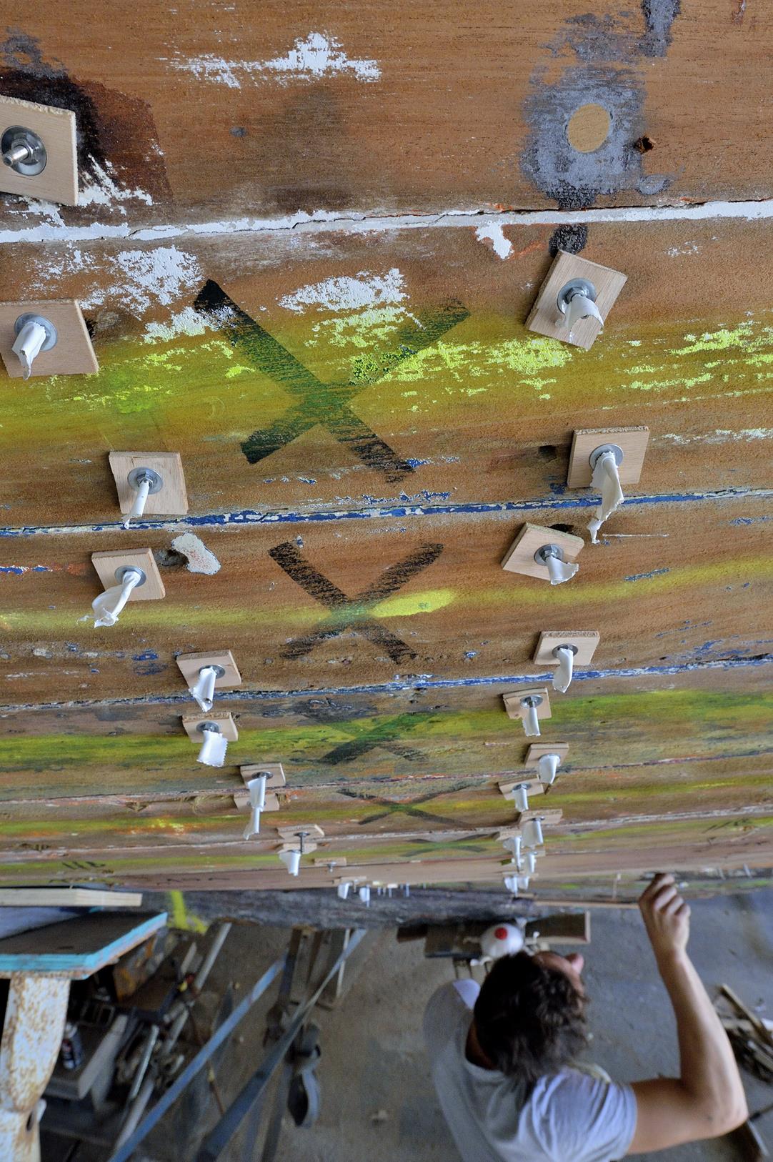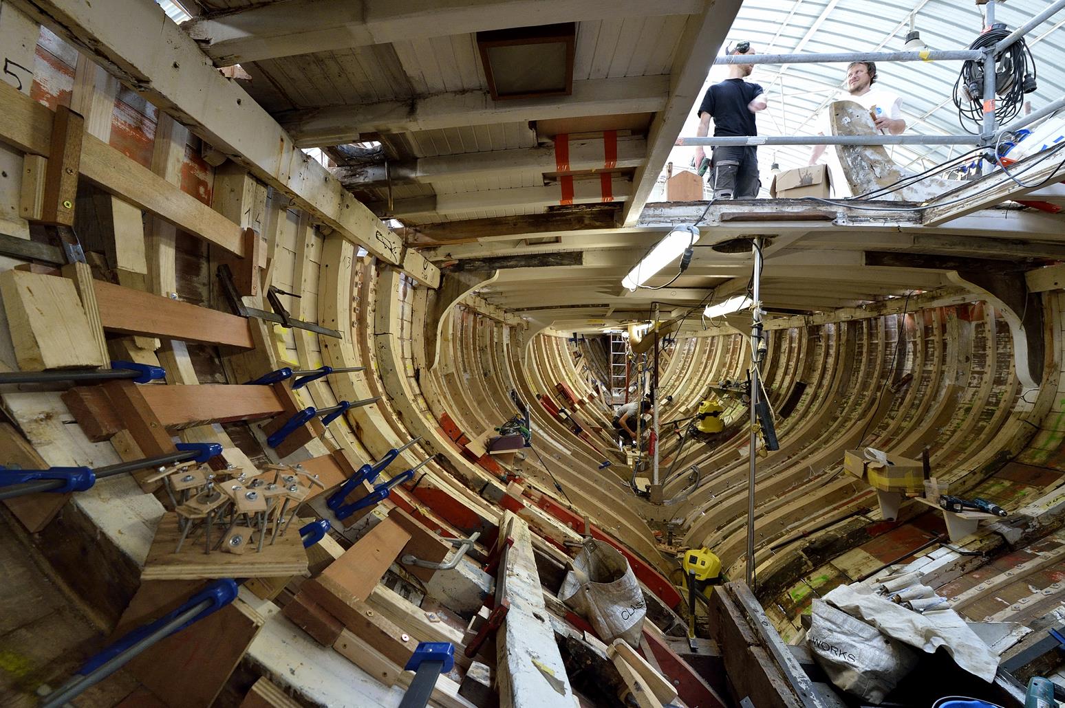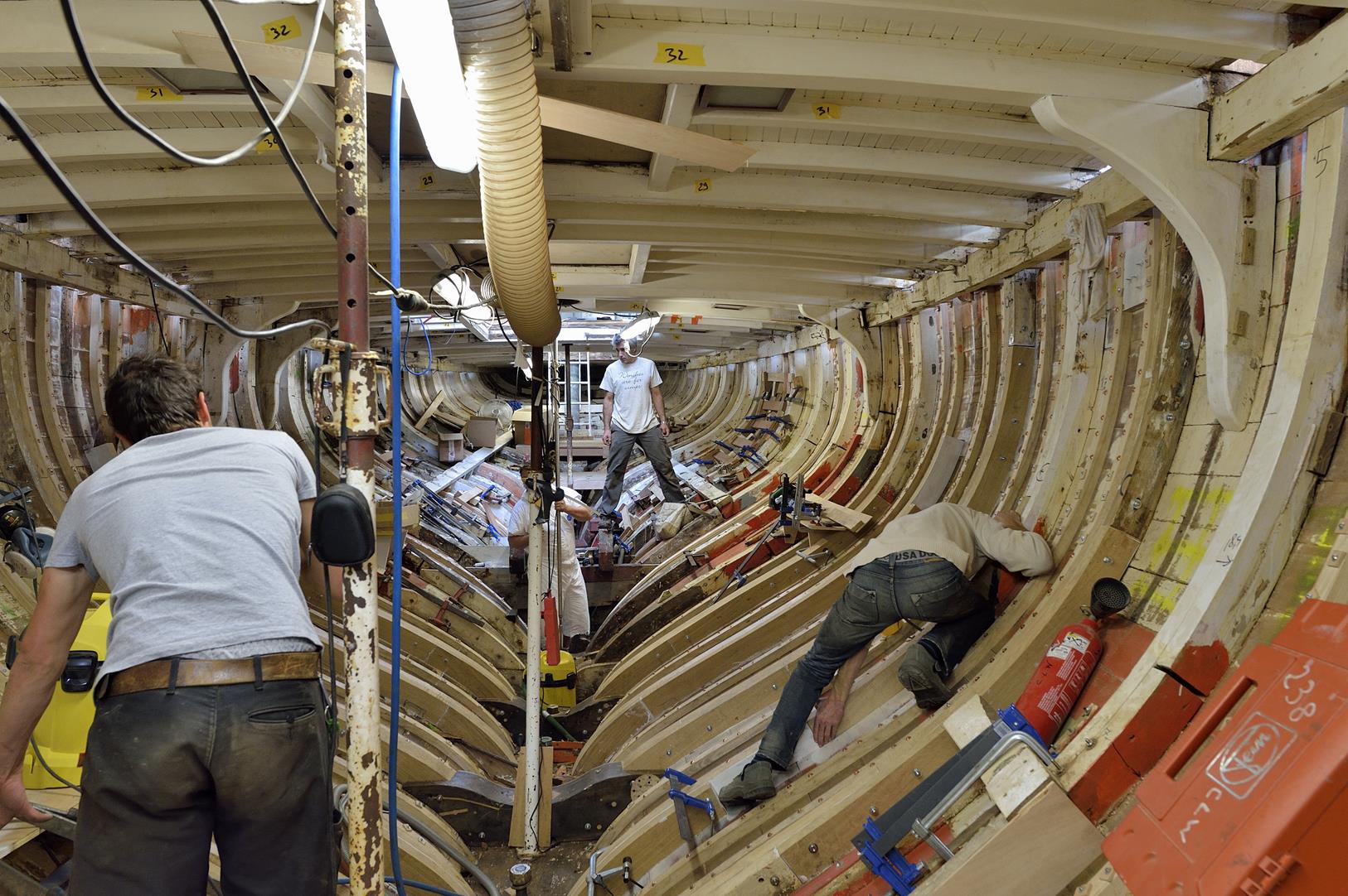 Templates laid out on top of grown oak bends for new sawn frames aft. New “laminated” steam bent frames aft Templates laid out on top of grown oak bends for new sawn frames aft. Damaged wood around rudder tube in horn timber Damaged wood around rudder tube in horn timber New “laminated” steam bent frames aft