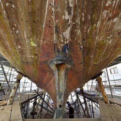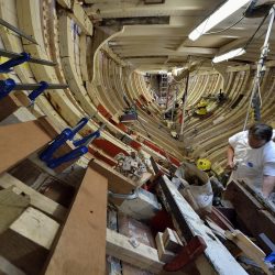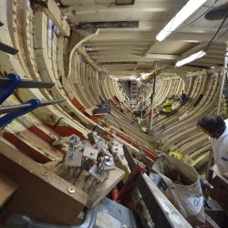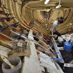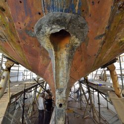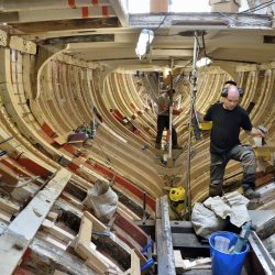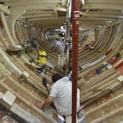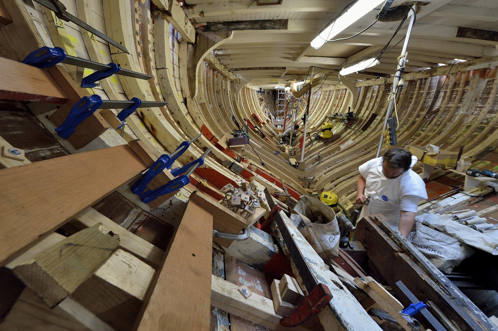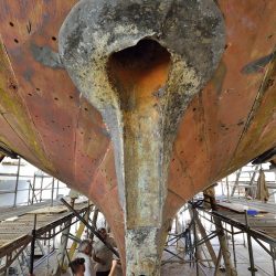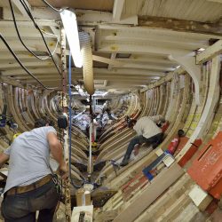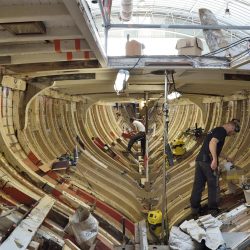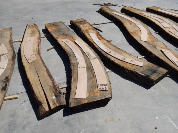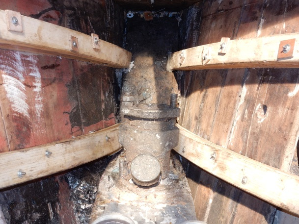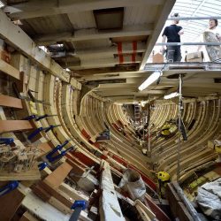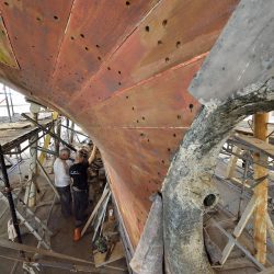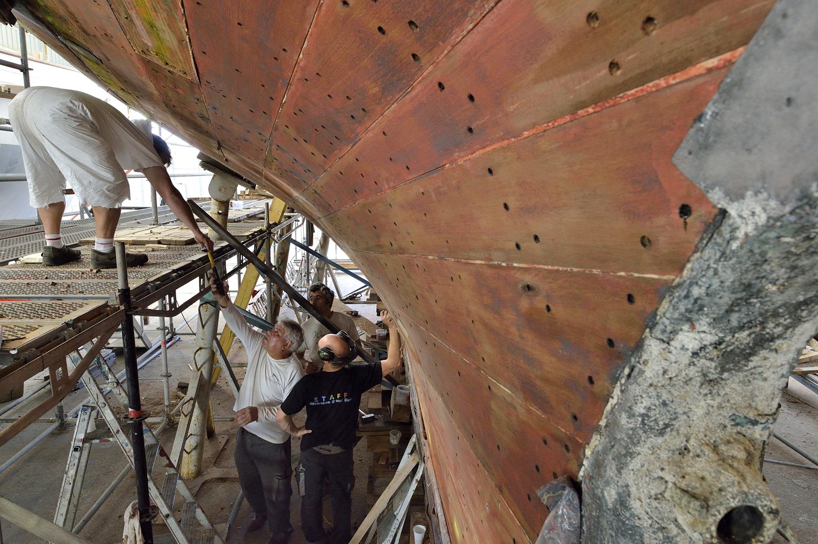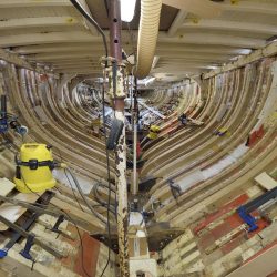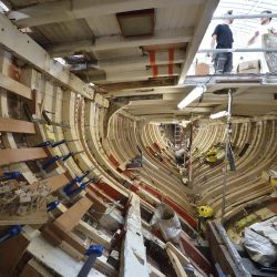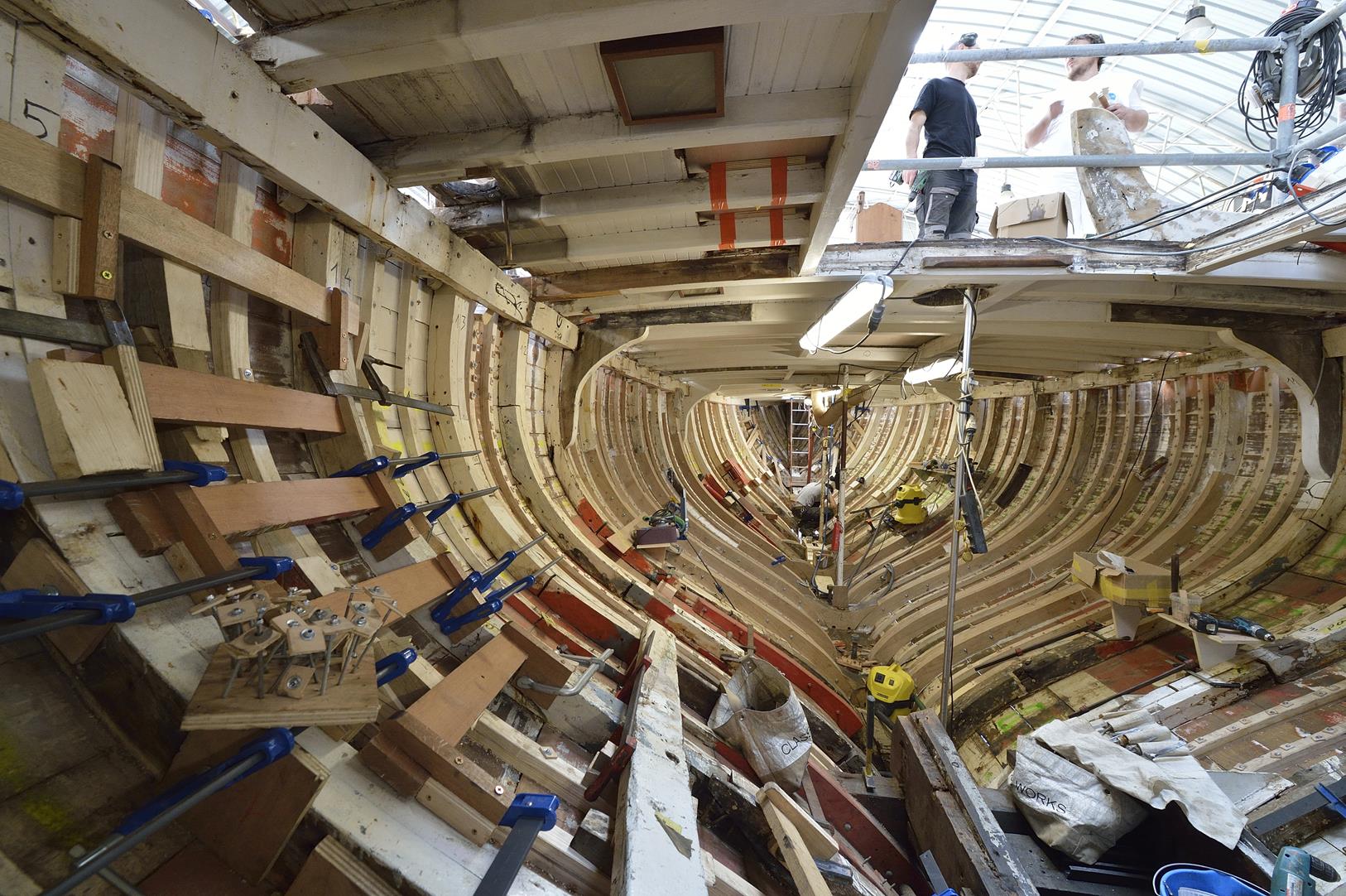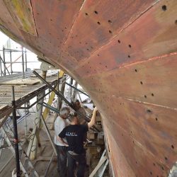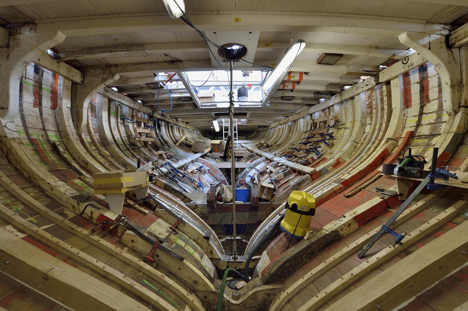 Templates laid out on top of grown oak bends for new sawn frames aft. New “laminated” steam bent frames aft Templates laid out on top of grown oak bends for new sawn frames aft. Damaged wood around rudder tube in horn timber Damaged wood around rudder tube in horn timber New “laminated” steam bent frames aft