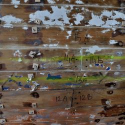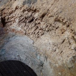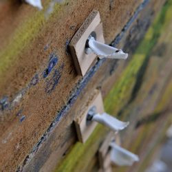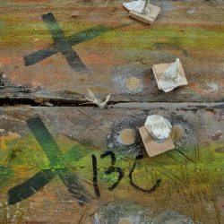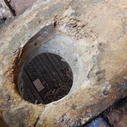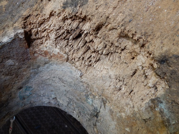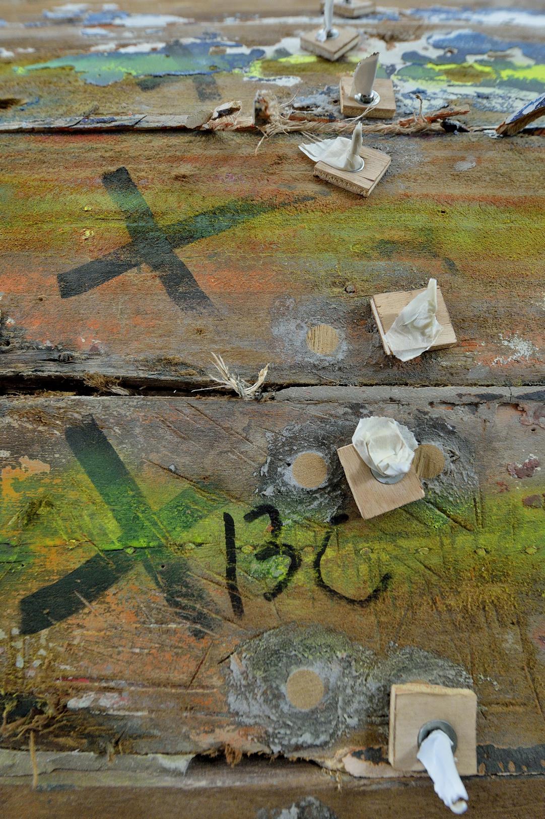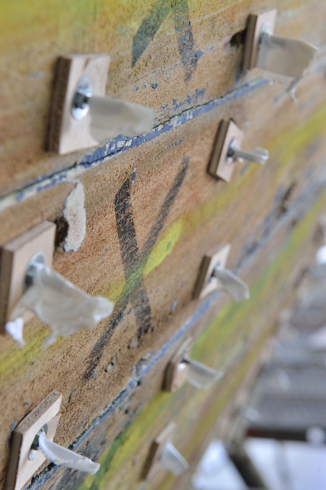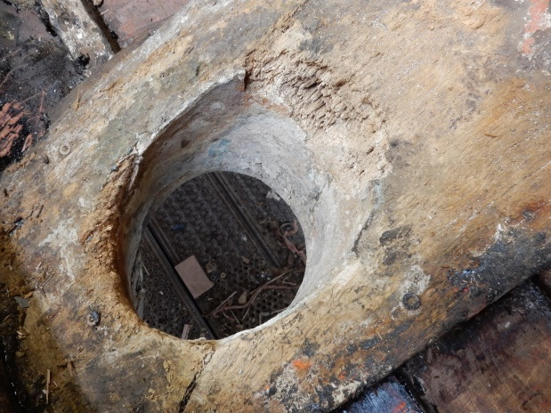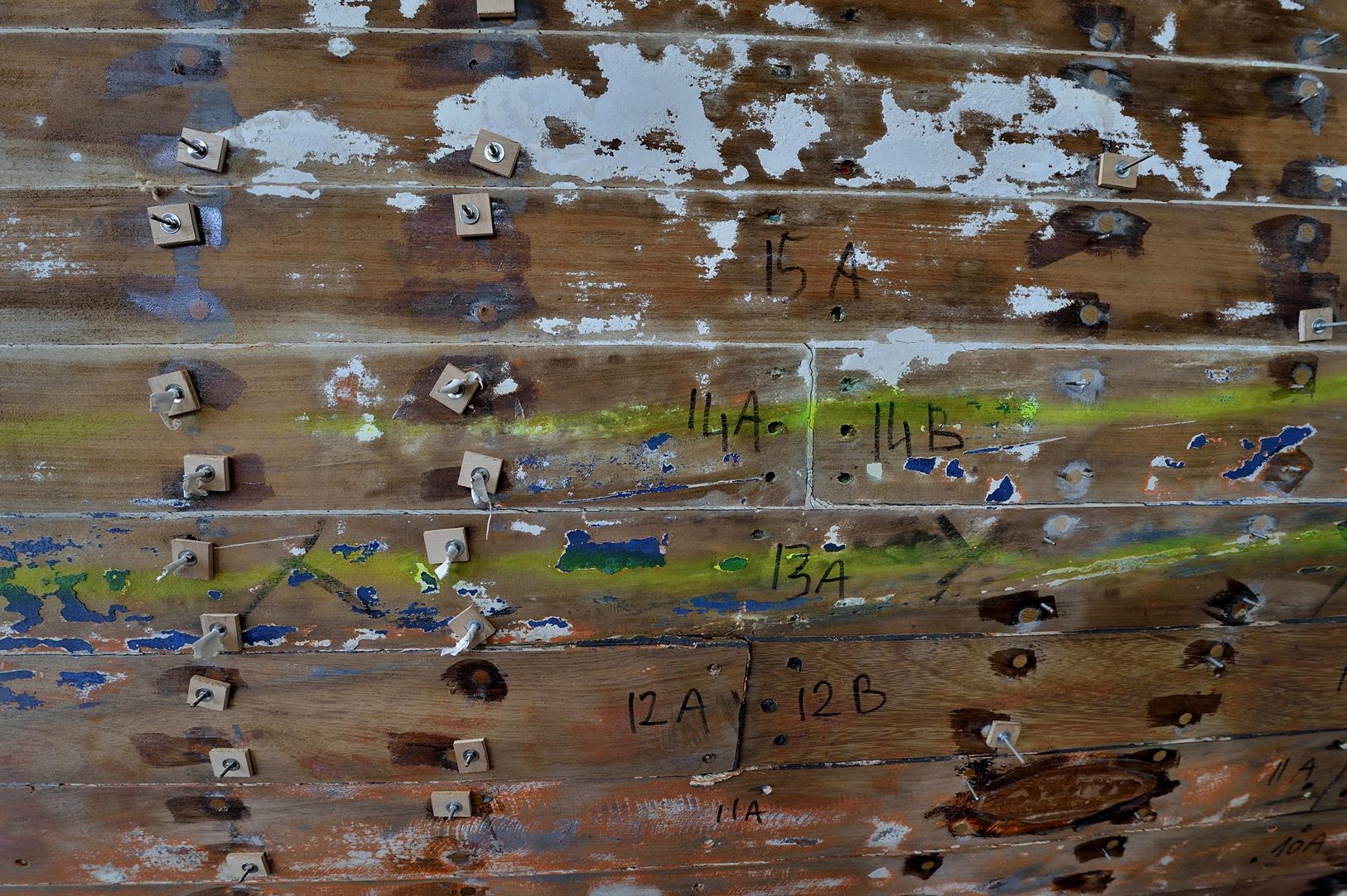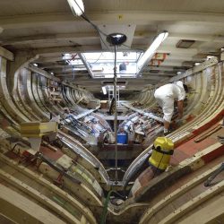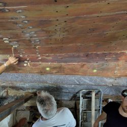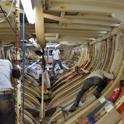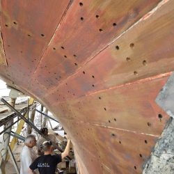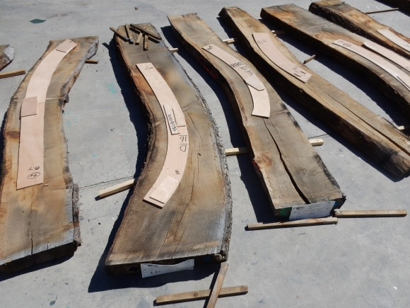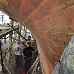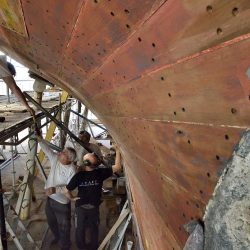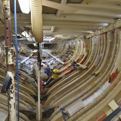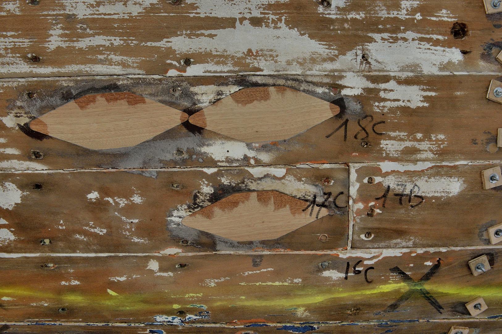 Templates laid out on top of grown oak bends for new sawn frames aft. New “laminated” steam bent frames aft Templates laid out on top of grown oak bends for new sawn frames aft. Damaged wood around rudder tube in horn timber Damaged wood around rudder tube in horn timber New “laminated” steam bent frames aft