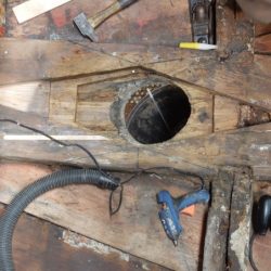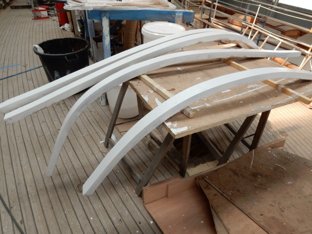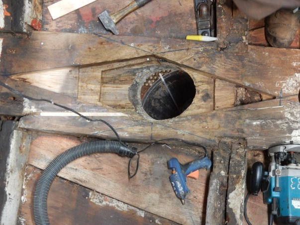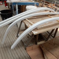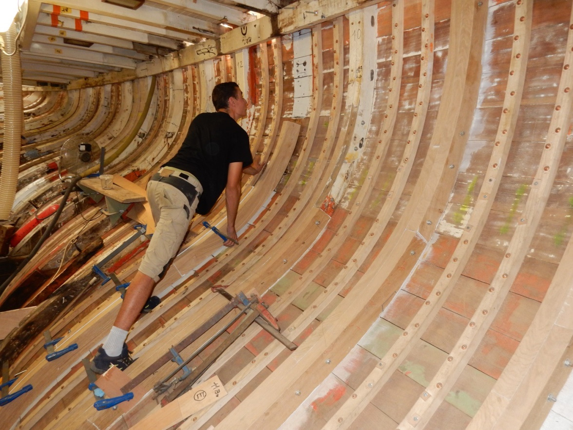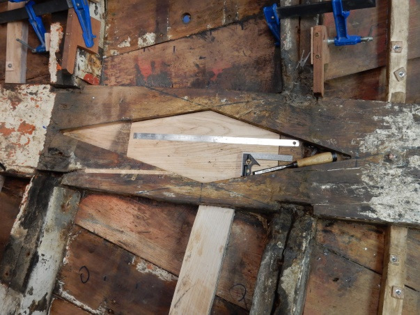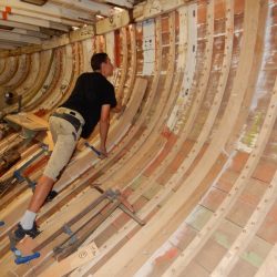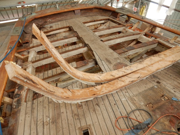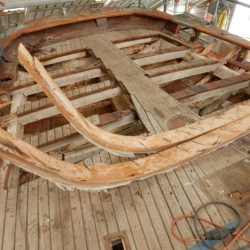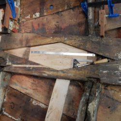 “Grown” sawn frame installation including simultaneous local hull planking repair.