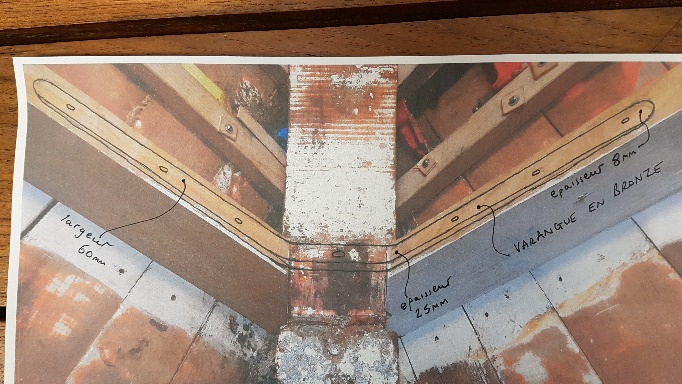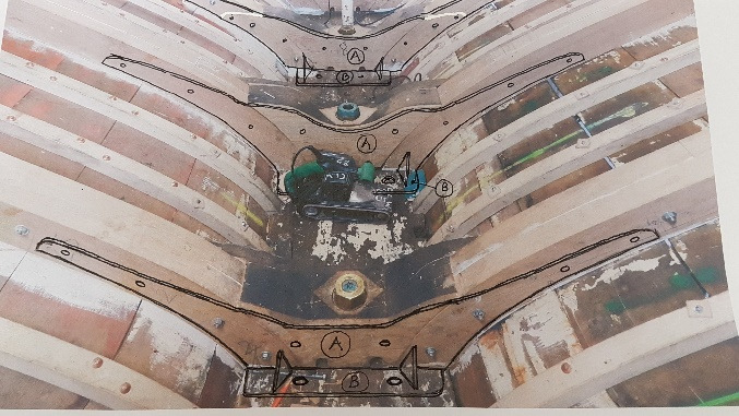Sketch of typical proposed new bronze plate floors and plywood templates of two floors. Note in the sketch: the two bronze bolts securing the floors to the wooden keel, independent of the lead keel bolts. Sketches not to scale.
