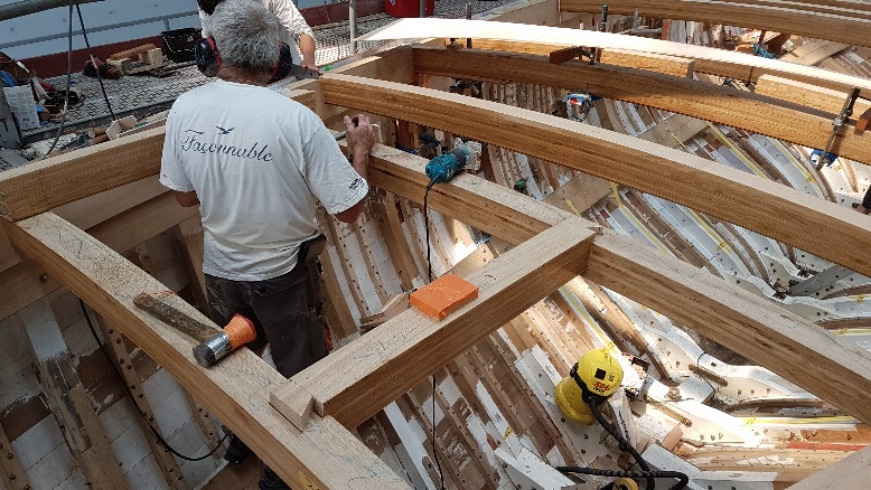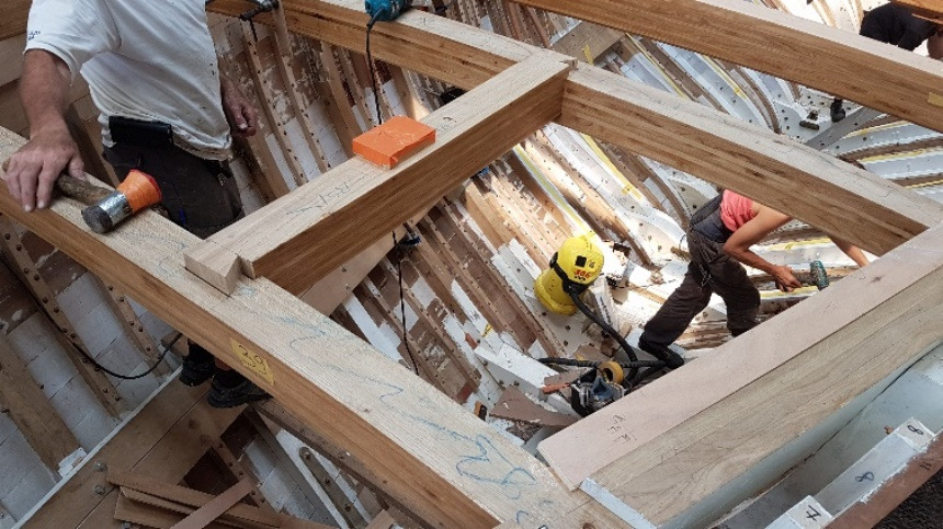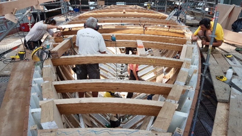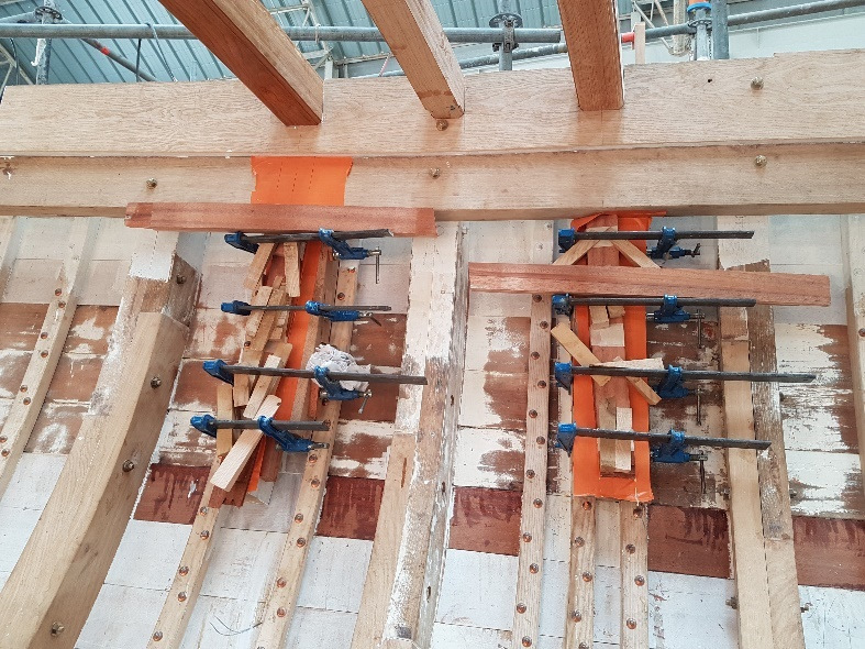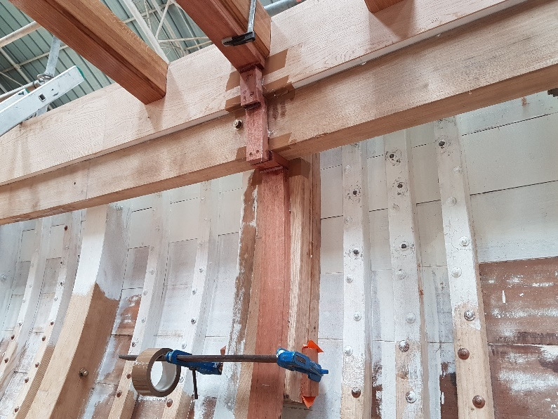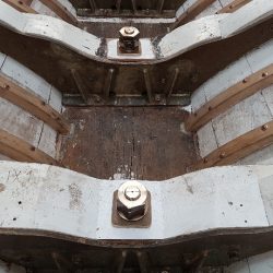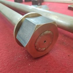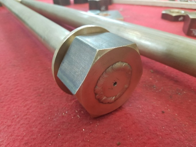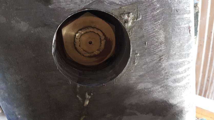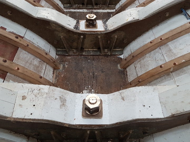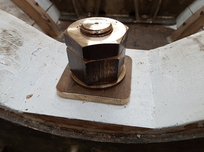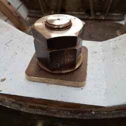 Finished keel bolt countersunk into lead keel. The holes will be plugged with lead bungs, jacked up and pushed into place with mastic.