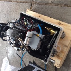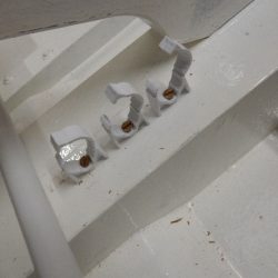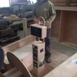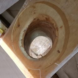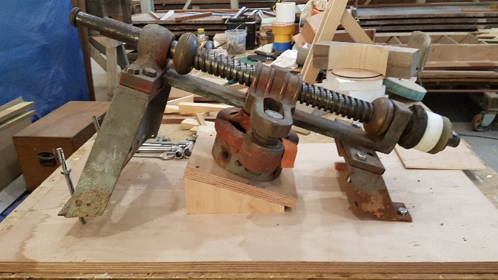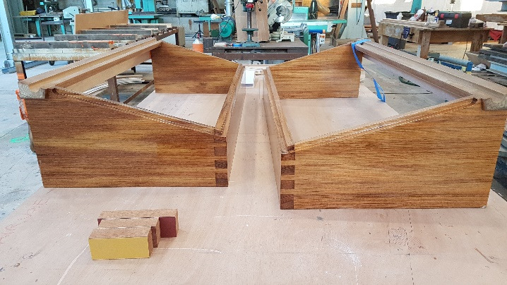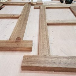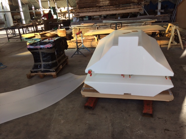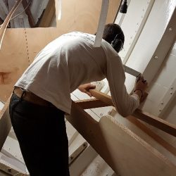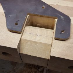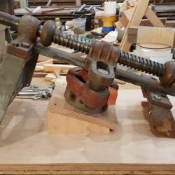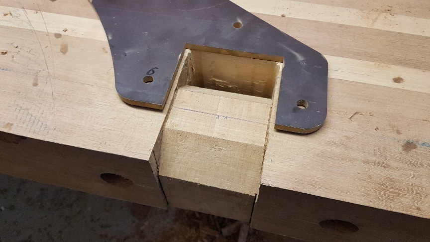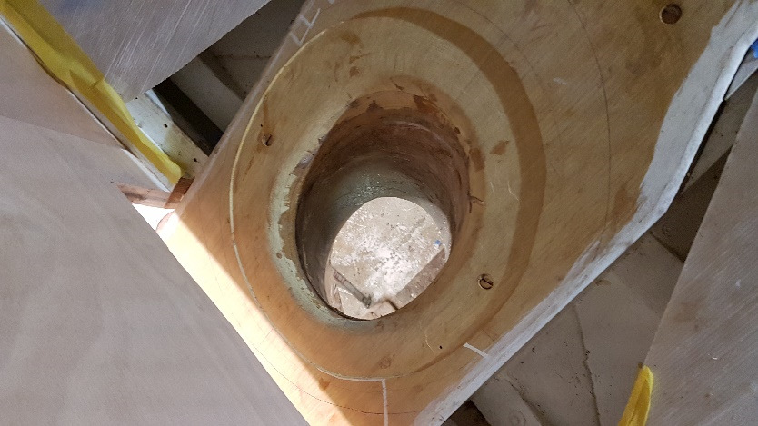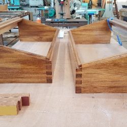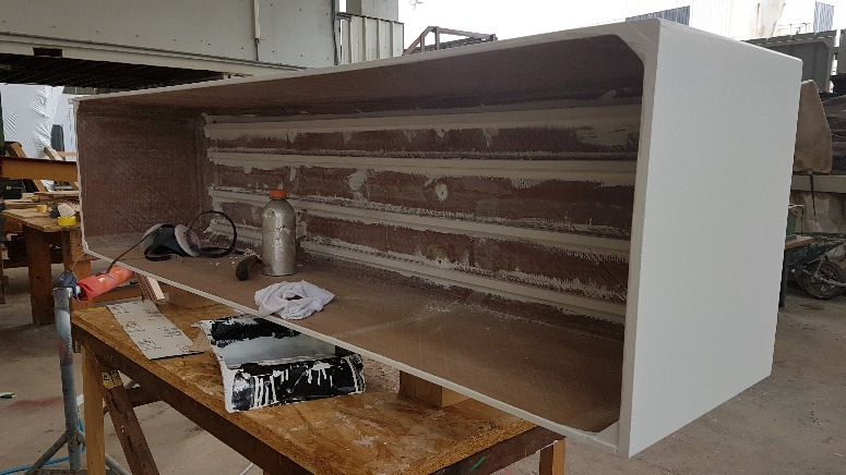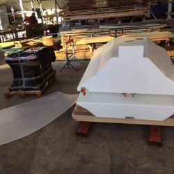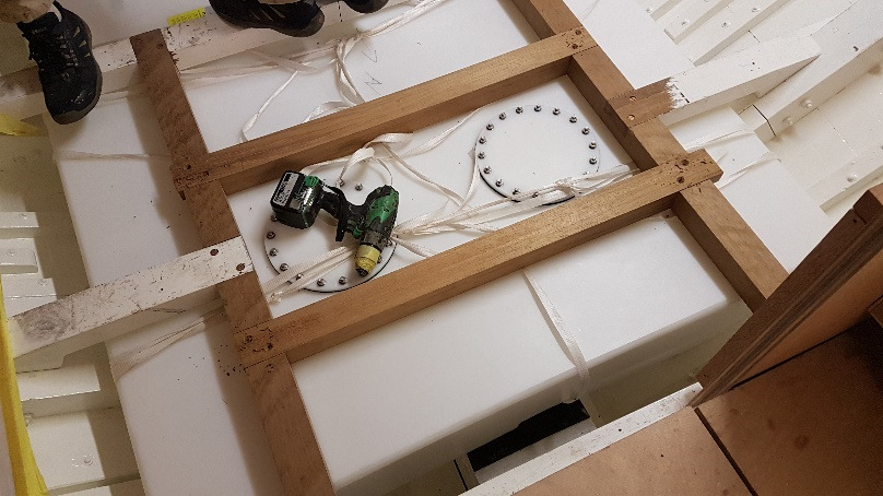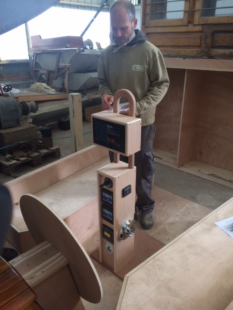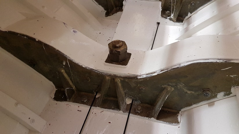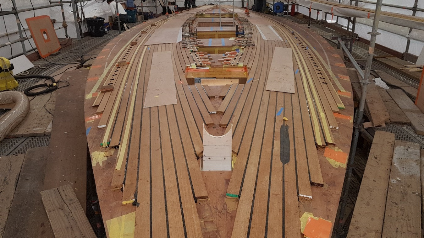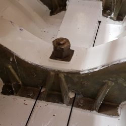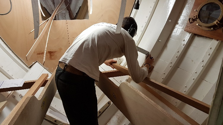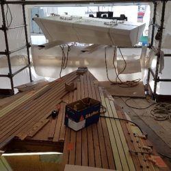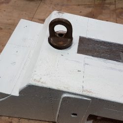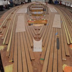 Bronze eye to take tie rod underneath mainmast forestay bottlescrew at foremast base Limber hole cord in place prior to tank installation Mock-up works on the forward cabin for owner approval Tank in situ with owners’ cabin sole beams cut to fit to inspection openings Piping clips with bronze screws into oak frames below the cabin sole level. Battery box with glassed interior Doghouse skylight cover frames Doghouse skylights with sealer coats of varnish. Deck strake works nearing completion Original steering mechanism set-up for angle and auto pilot motor checks Woodworks faired where lower section of rudder trunk passes through the hull Detail of bronze rudder strap at mid-bearing prior to being let-in to the rudder blade. Tank being lifted up onto the deck for first fitting
