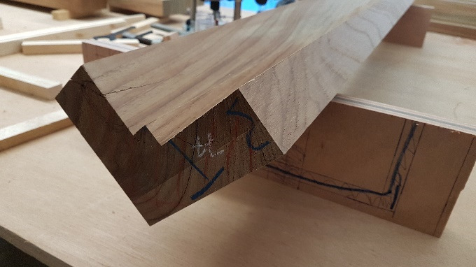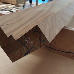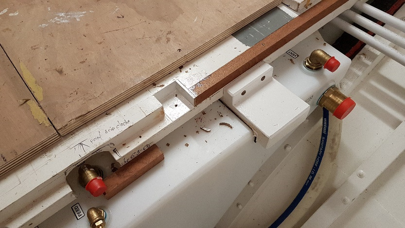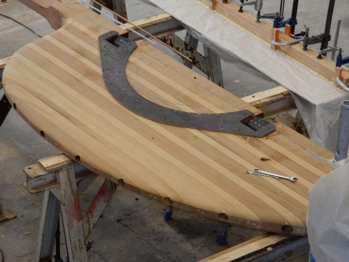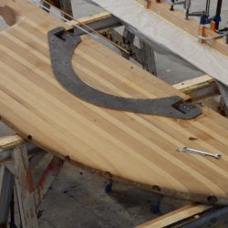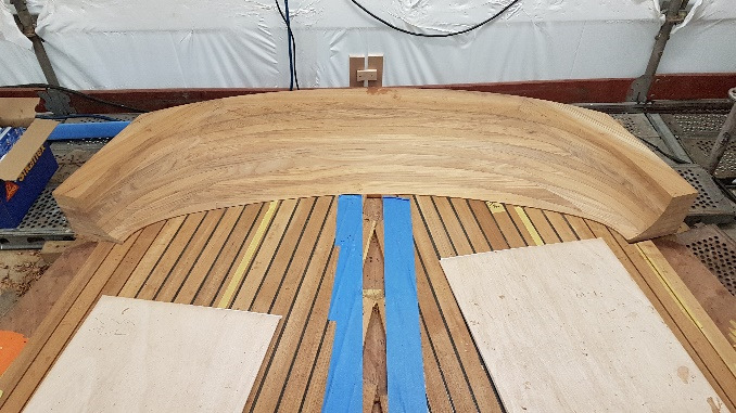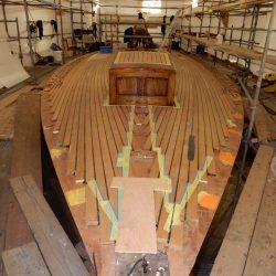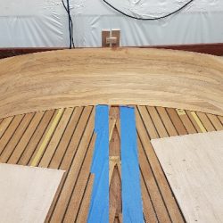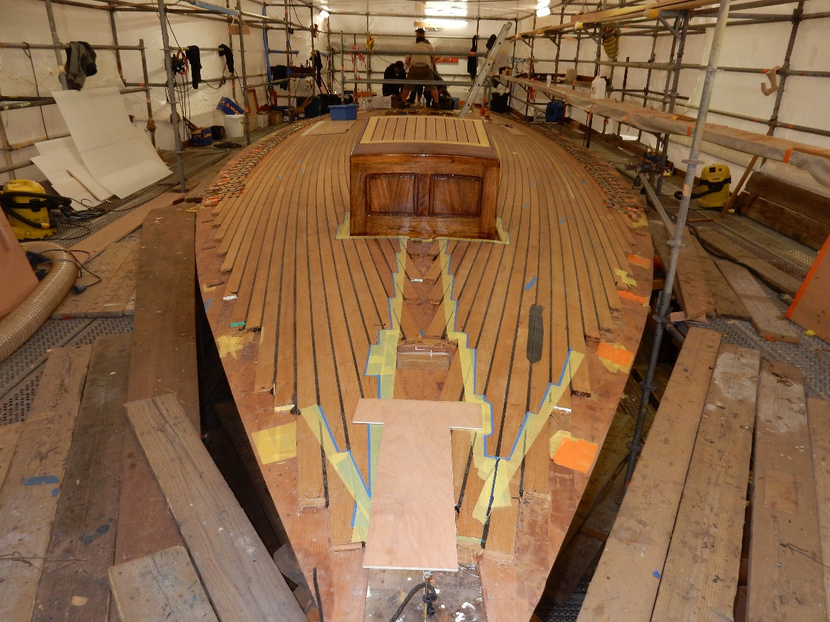 New teak decking from bow with restored original forehatch in place for marking of margins