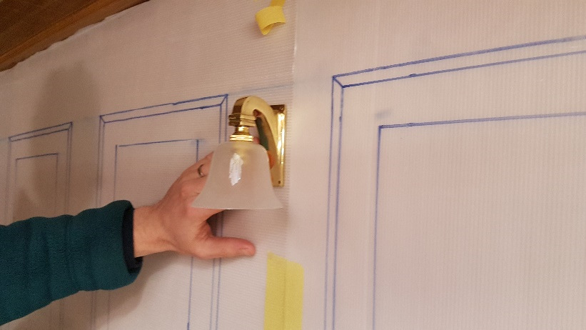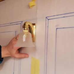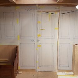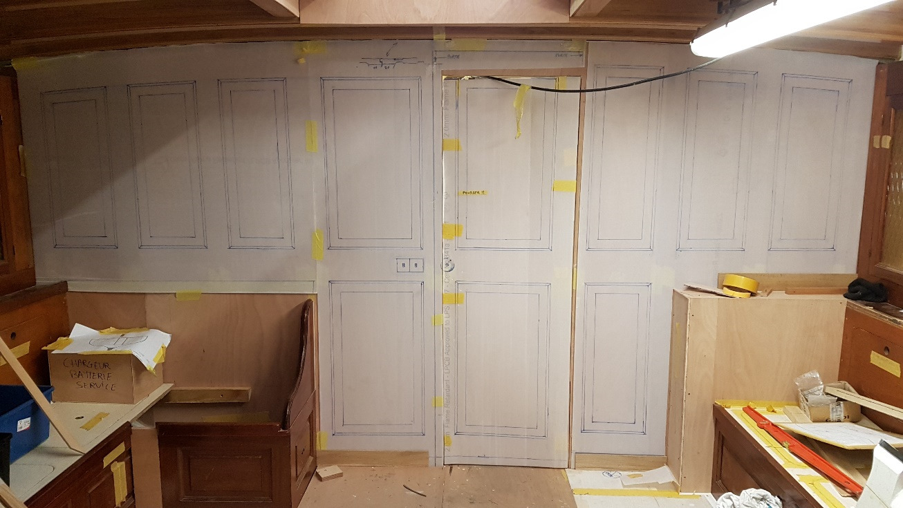 Draft panelling layout with door - on forward bulkhead in main saloon. Light switches also marked.