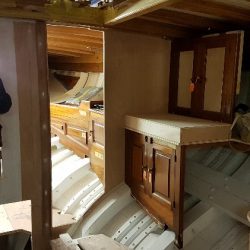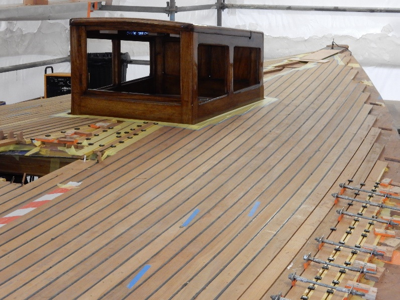 Restored original forehatch in place on new decking. Glass and aft doors yet to be installed.