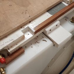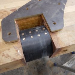 Semi-circular delryn bearings screwed to stock in way of rudder straps.