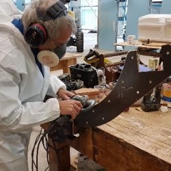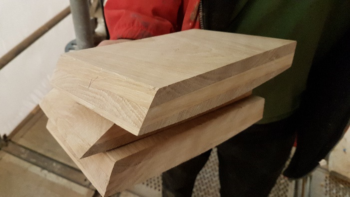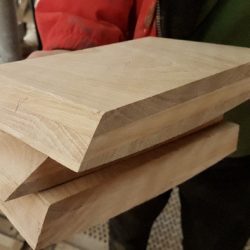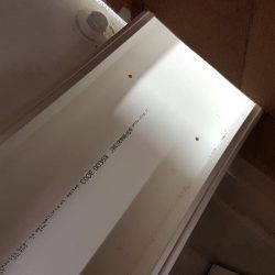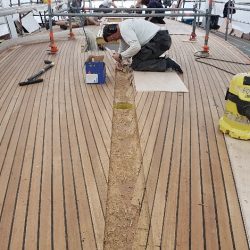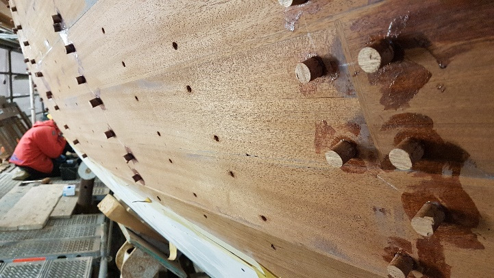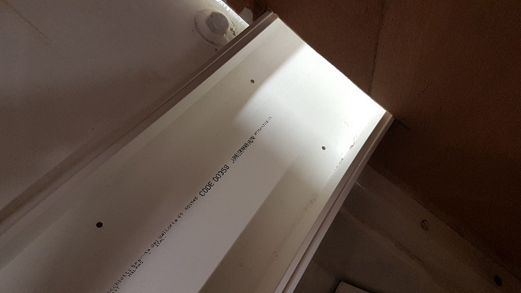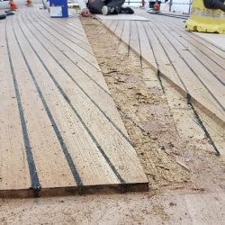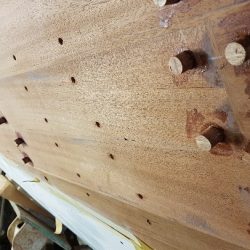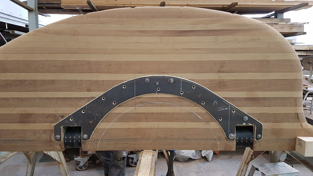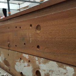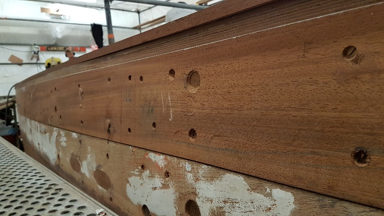 Deck edge overlap above sheer strake showing amount to be filled in and faired