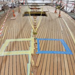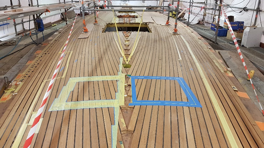 Aft deck marked up for deck hatch margins choice – right hand one chosen, no margins.
