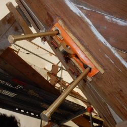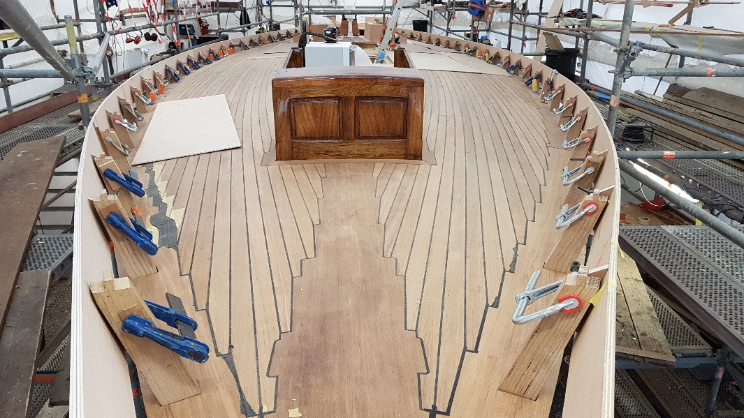Two deep plywood battens have been temporarily clamped either side of the deck on the wooden stanchions in order to finalise the sheer-line. A deep batten is necessary because it is not possible to stand back and see the sheer-line from a distance (because the boat is in a shed surrounded by scaffolding) so the batten is relied on to give a fair line, something that a less wide batten would not be able to do.