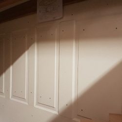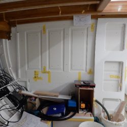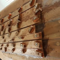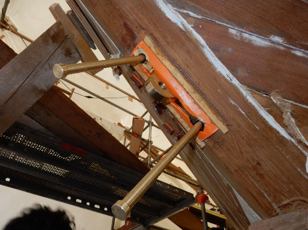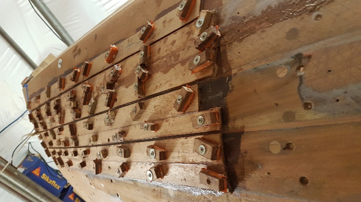Likewise, when Armide arrived at Classic Works she was hogged at both sets of chain-plates. This hogging, caused by the tension in the yachts rigging pulling the sides of the yacht upwards over many years, had left permanent bumps of up to about 4 cms in both sides of the sheer-line at the level of the masts’ chain-plates.