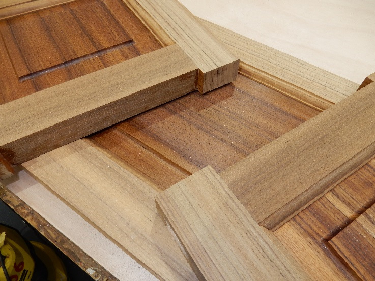 The unfairness in the topsides was therefore rectified by epoxy gluing sipo strips to the outside faces of the hull planking at and below the deck edge (max thickness 8mm in the least fair area aft but on average 3mm).