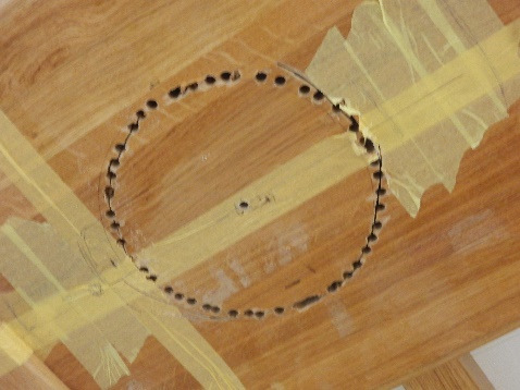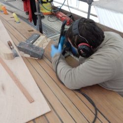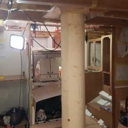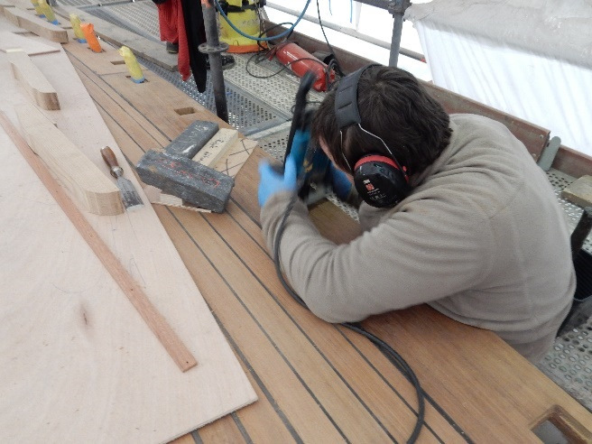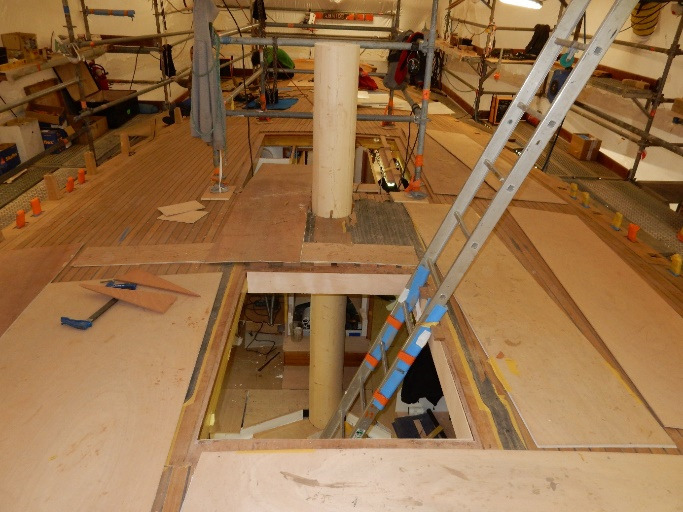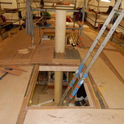 Oak blocking at mainmast drilled off prior to opening the hole for the mainmast.