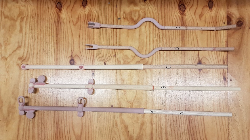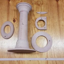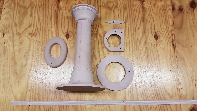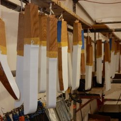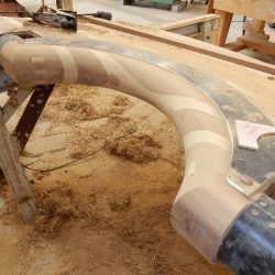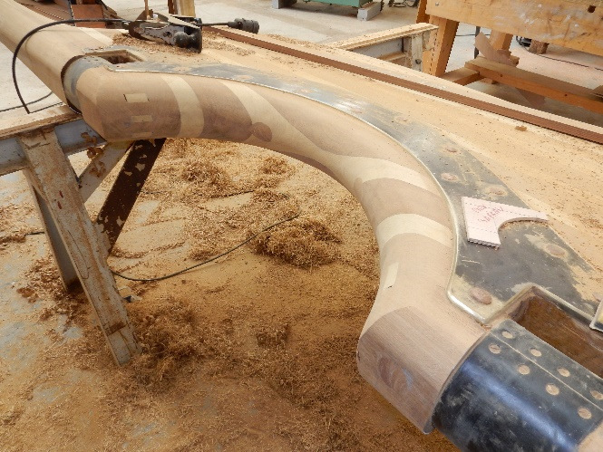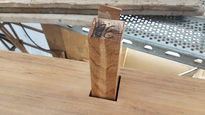 Oak bulwark stanchion rounded off, varnished and fitted prior to caulking