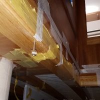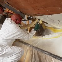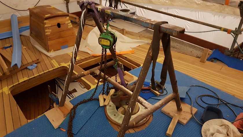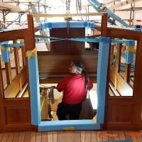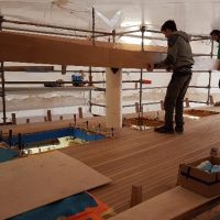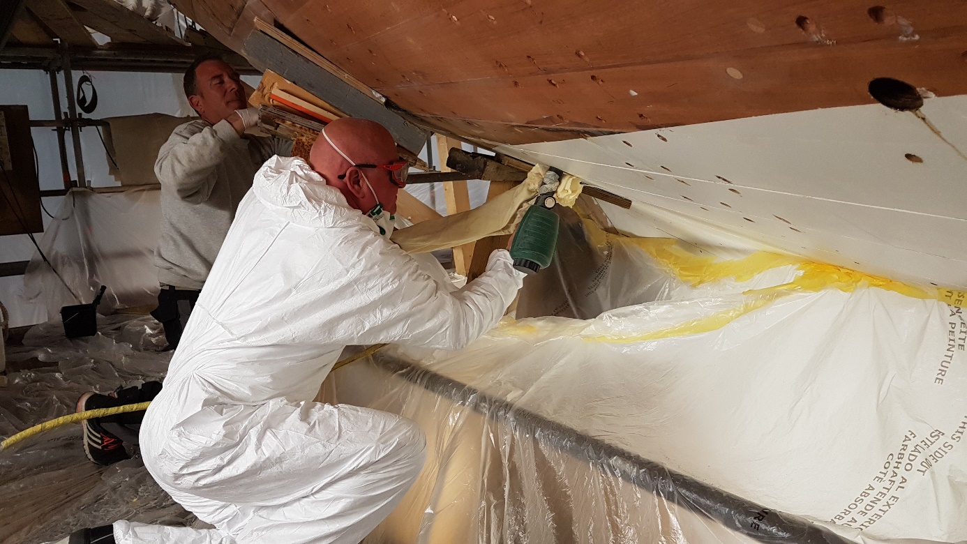 Paint team shot-blasting the rivet and bolt heads in the topsides.