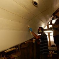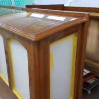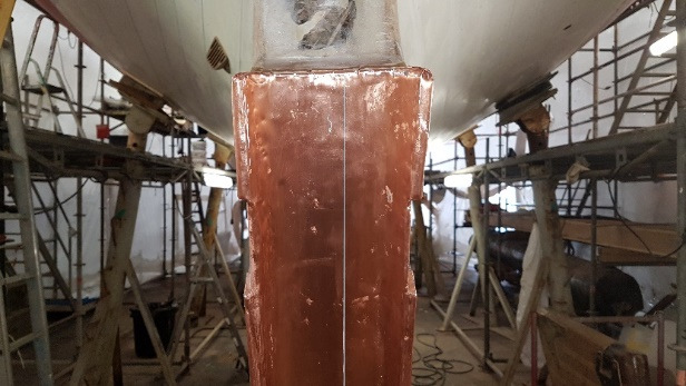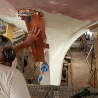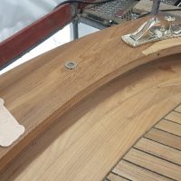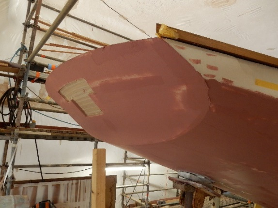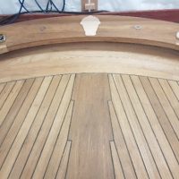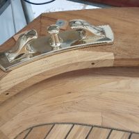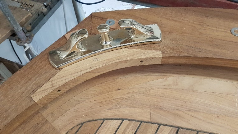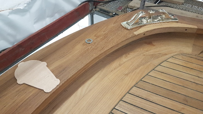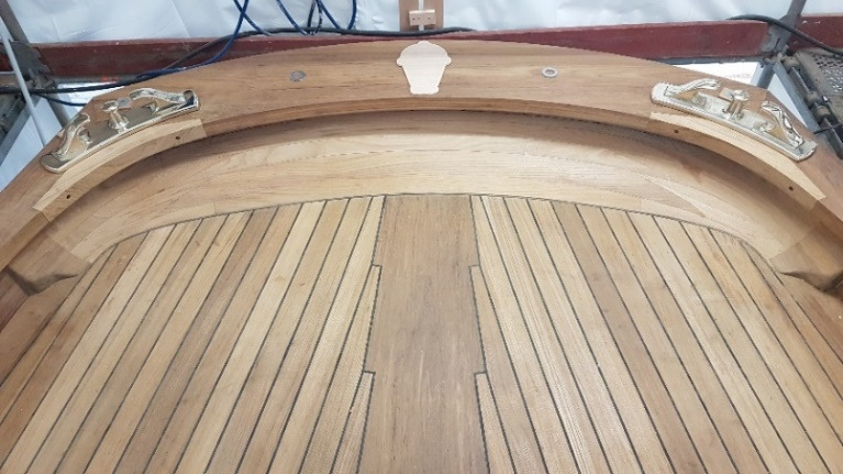 Transom fairing showing cut-out for the teak boards with name and owners’ motif