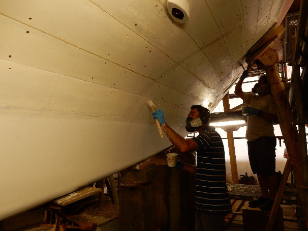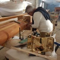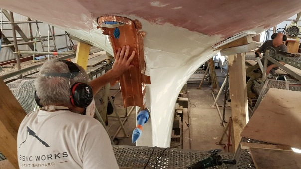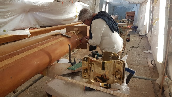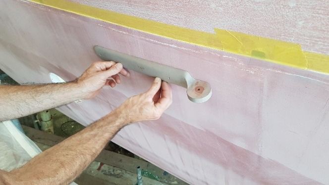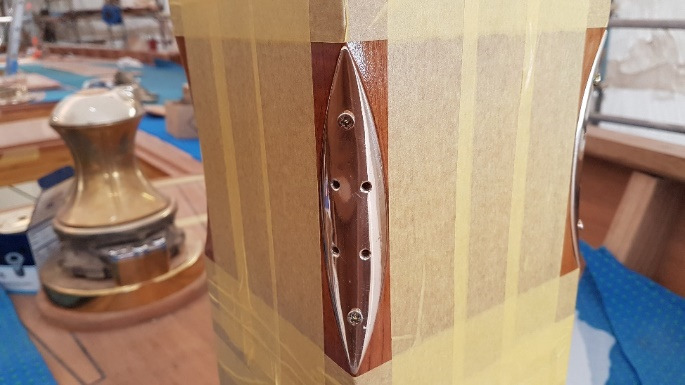 Checking the aft fairleads & stern light fitting template on the capping rail during fabrication