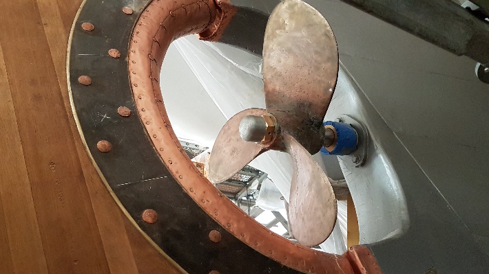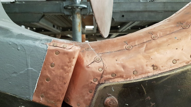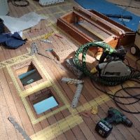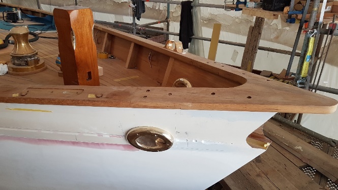 Foredeck from port showing hawse pipes, cove line, windlass and samson post.