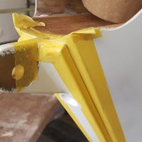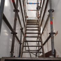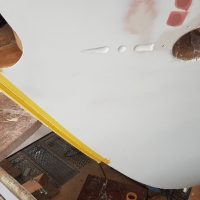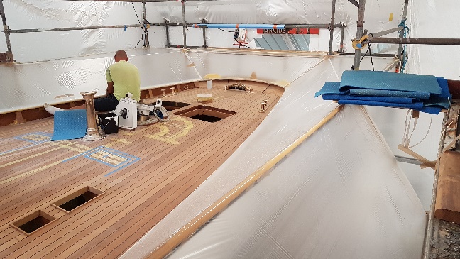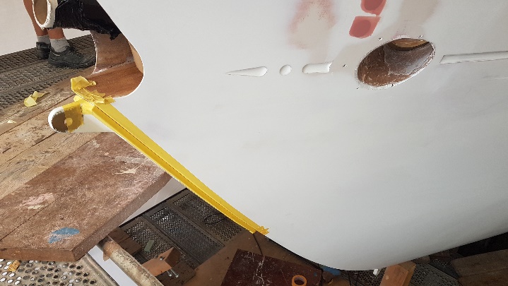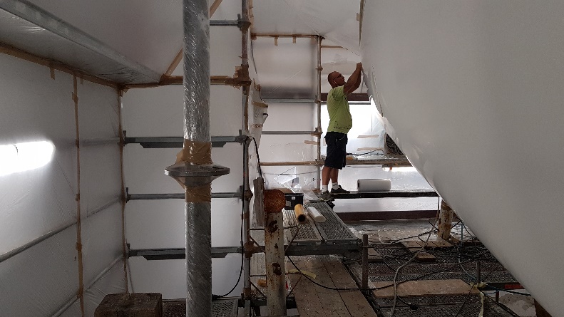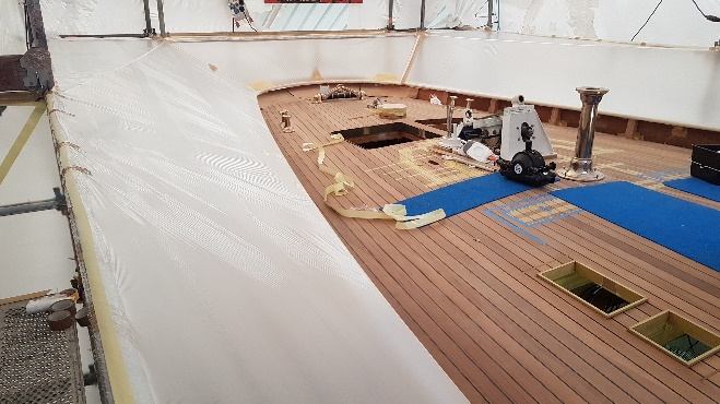 Plastic sheeting placed around the stern by the topsides painters to prevent dust