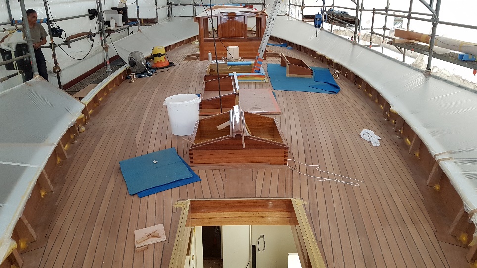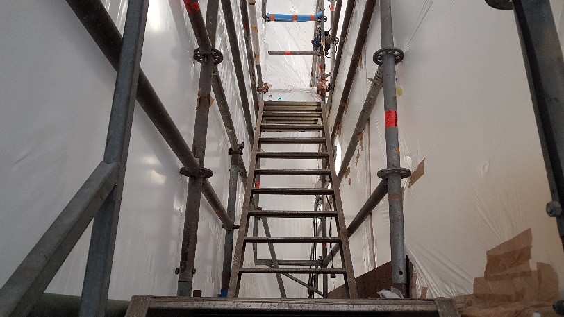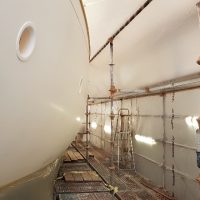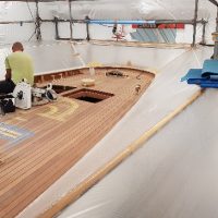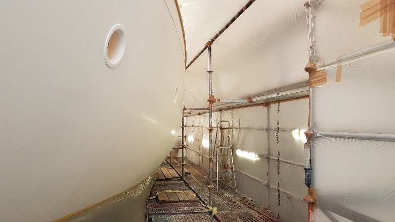 Plastic sheeting around the hull placed by the topsides painters to prevent dust