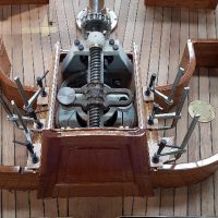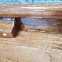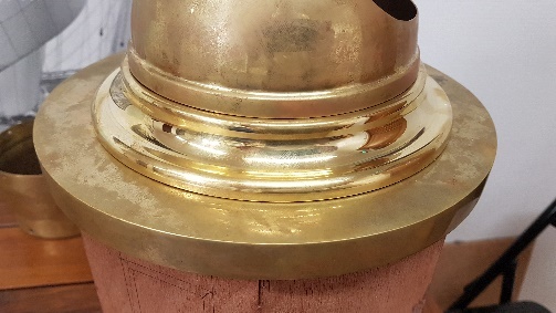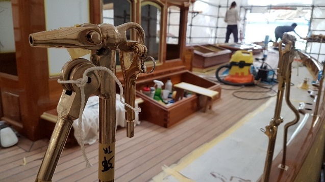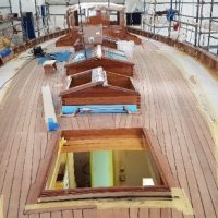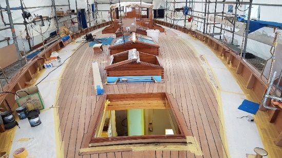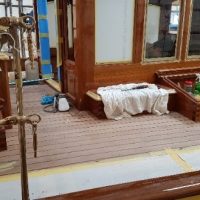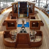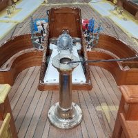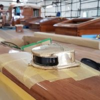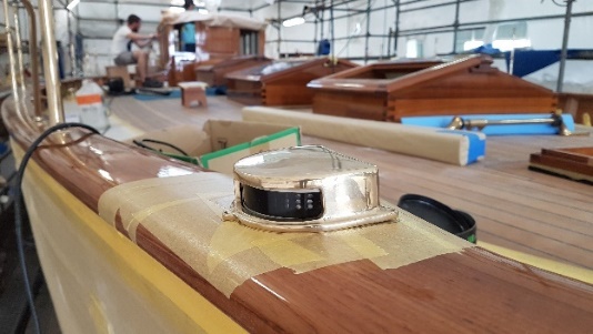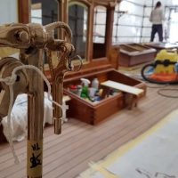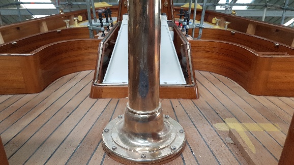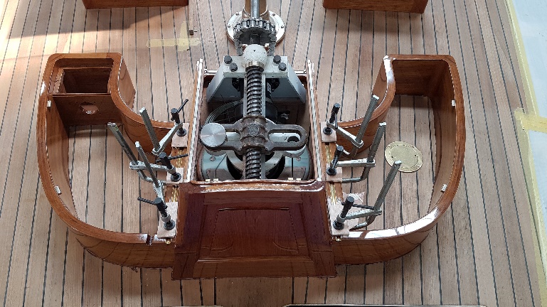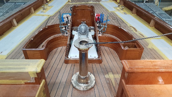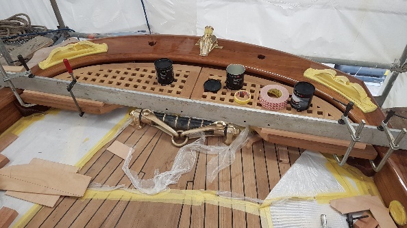 Helmsman’s seat base and two side boxes varnished and installed, with compass pedestal