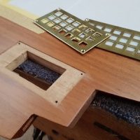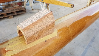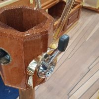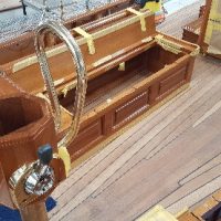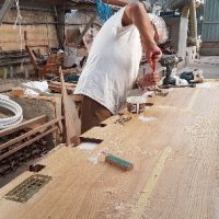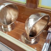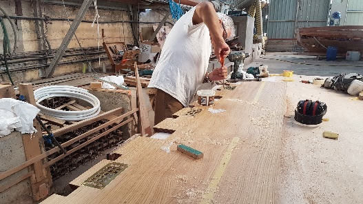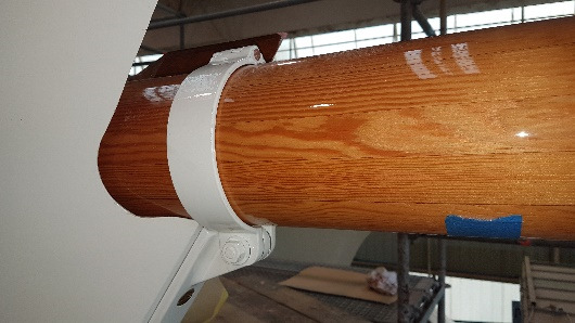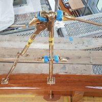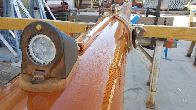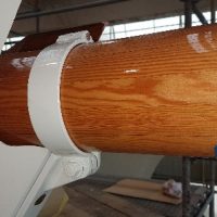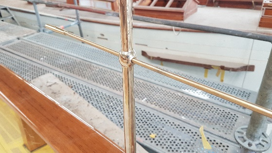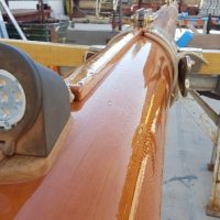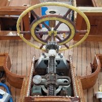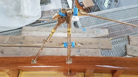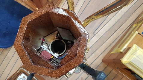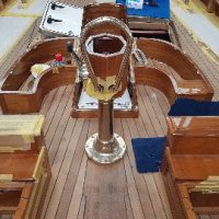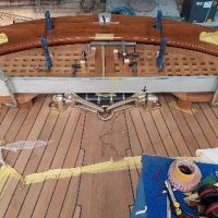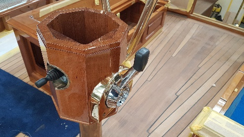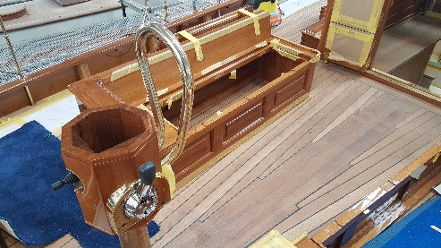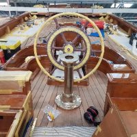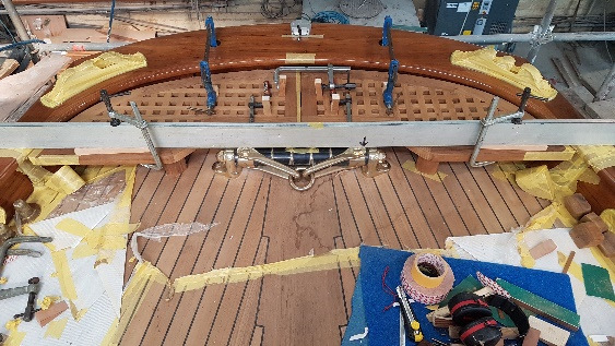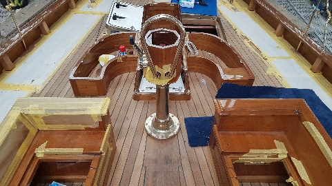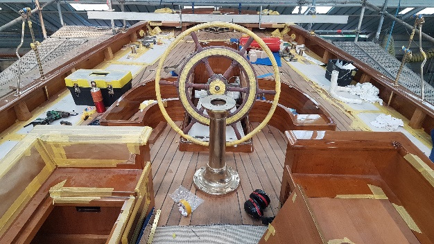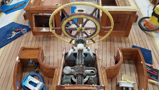 Aft deck works nearing completion with steering wheel installed for checks on the new pedestal.