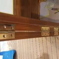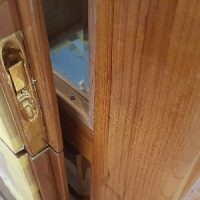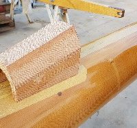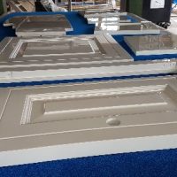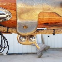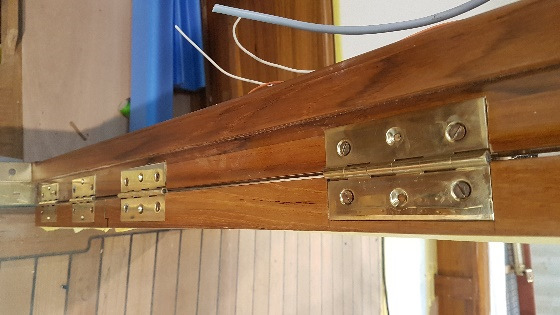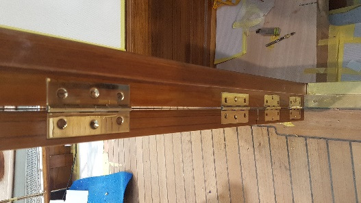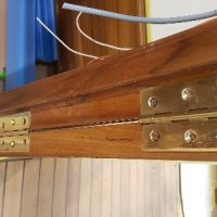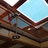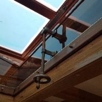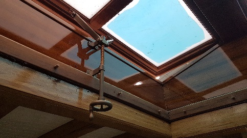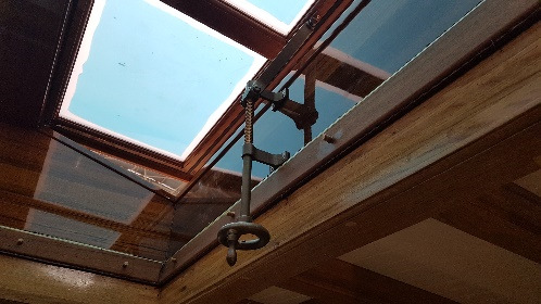 Skylight lifters installed with teak moulding strip at junction between skylight & deck beams