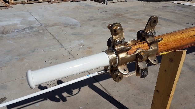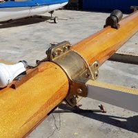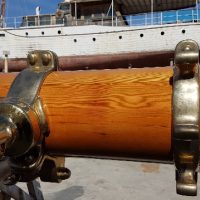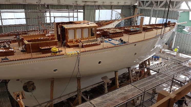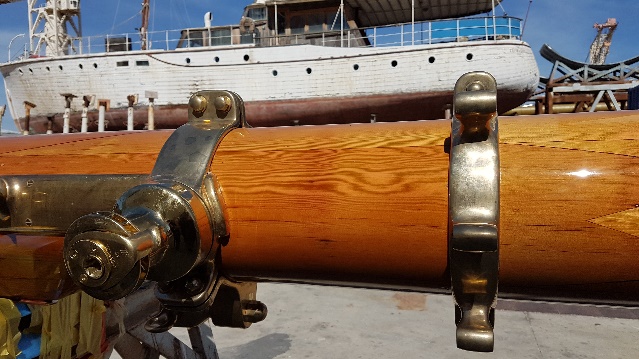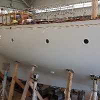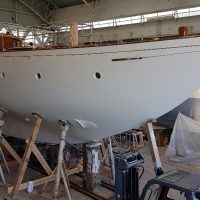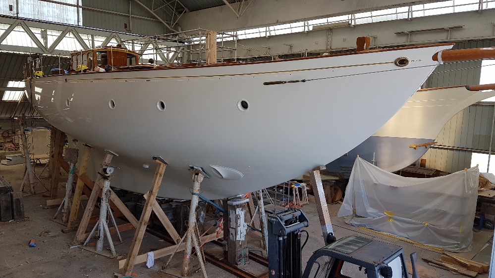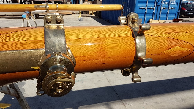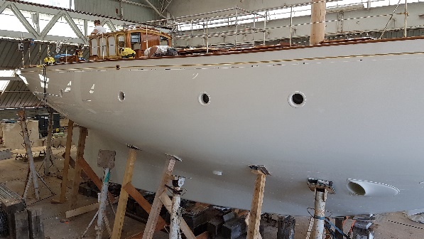 Final varnish coat on the masts and oyster white at mastheads